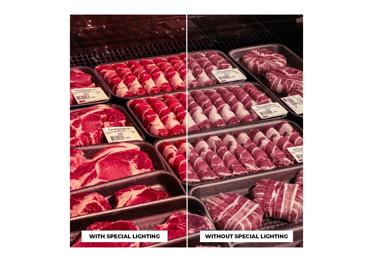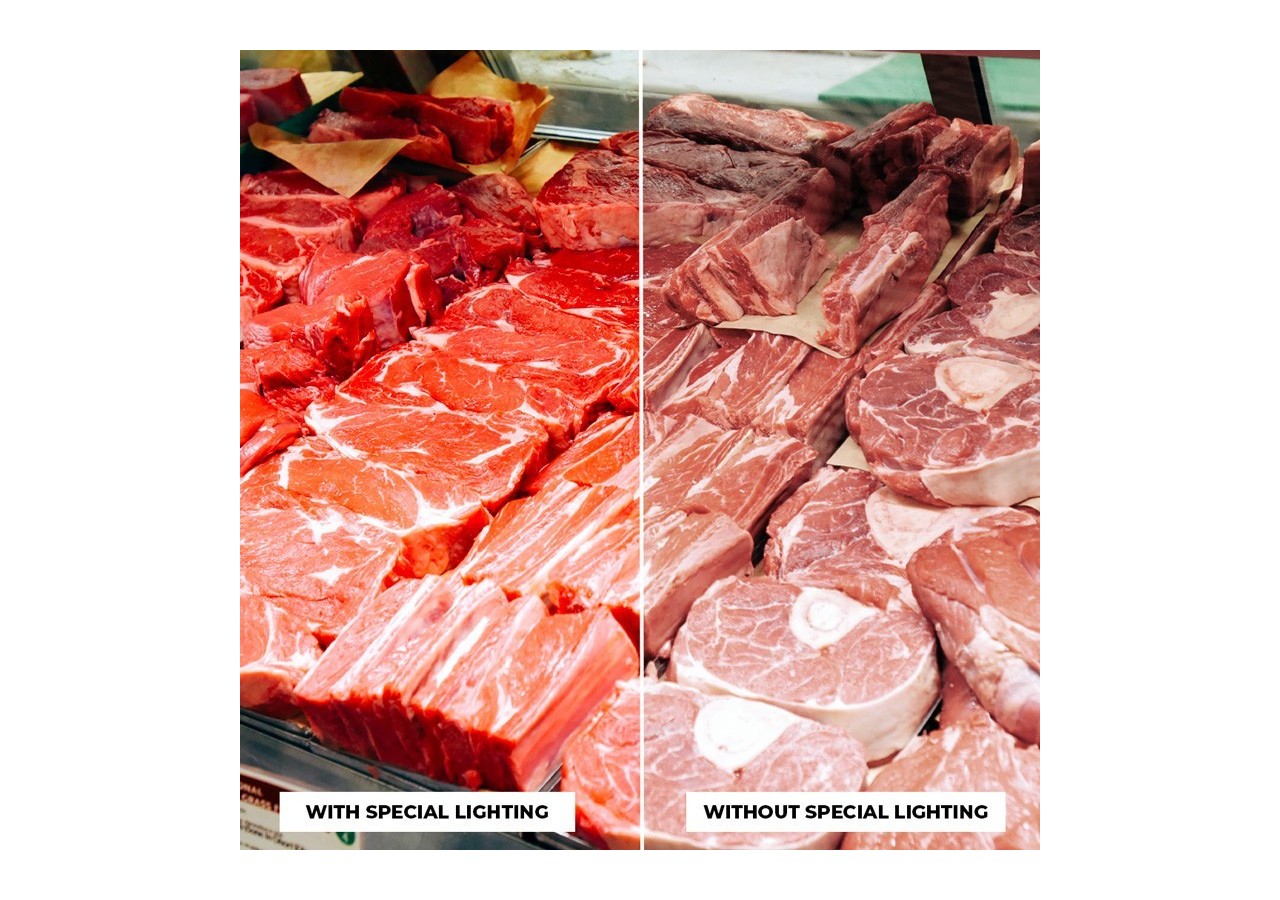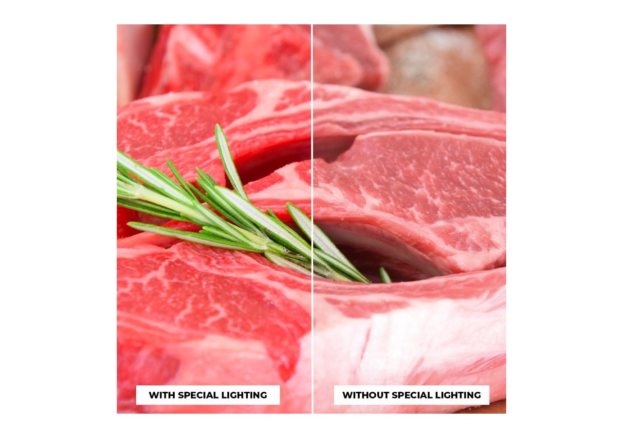 Il émet un éclairage dans une tonalité rose qui met en valeur la couleur rouge de la viande, lui donnant un aspect frais et appétissant. De cette manière, Le projecteur améliore la perception du produit par le client, favorisant ainsi la décision d'achat.