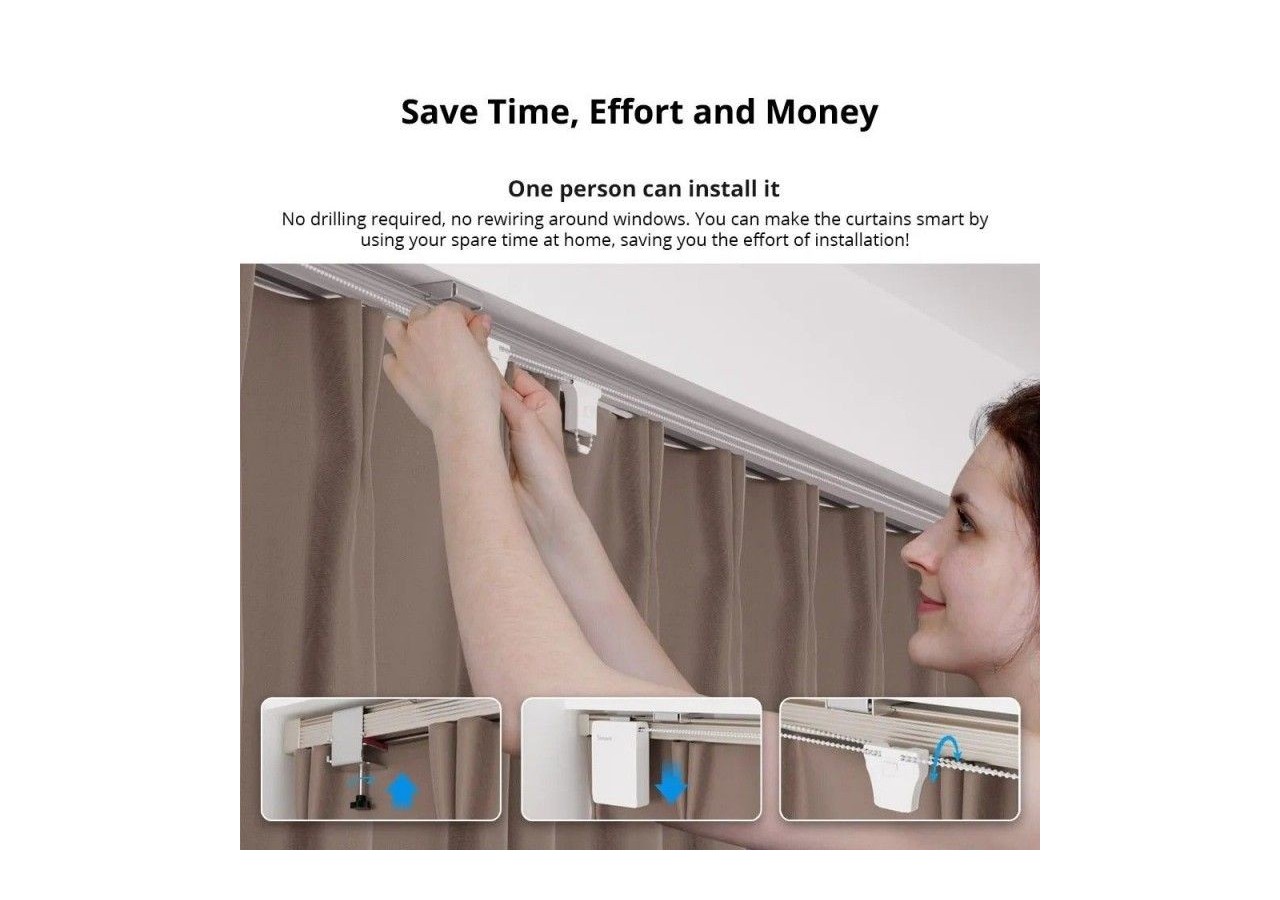 Compatible avec les rideaux simples et doubles (mais pas avec les rideaux courbés ou à barres), il dispose d'une commande pour arrêter ou démarrer le mouvement du rideau à tout moment et permet la programmation d'horaires et la configuration de scènes intelligentes.