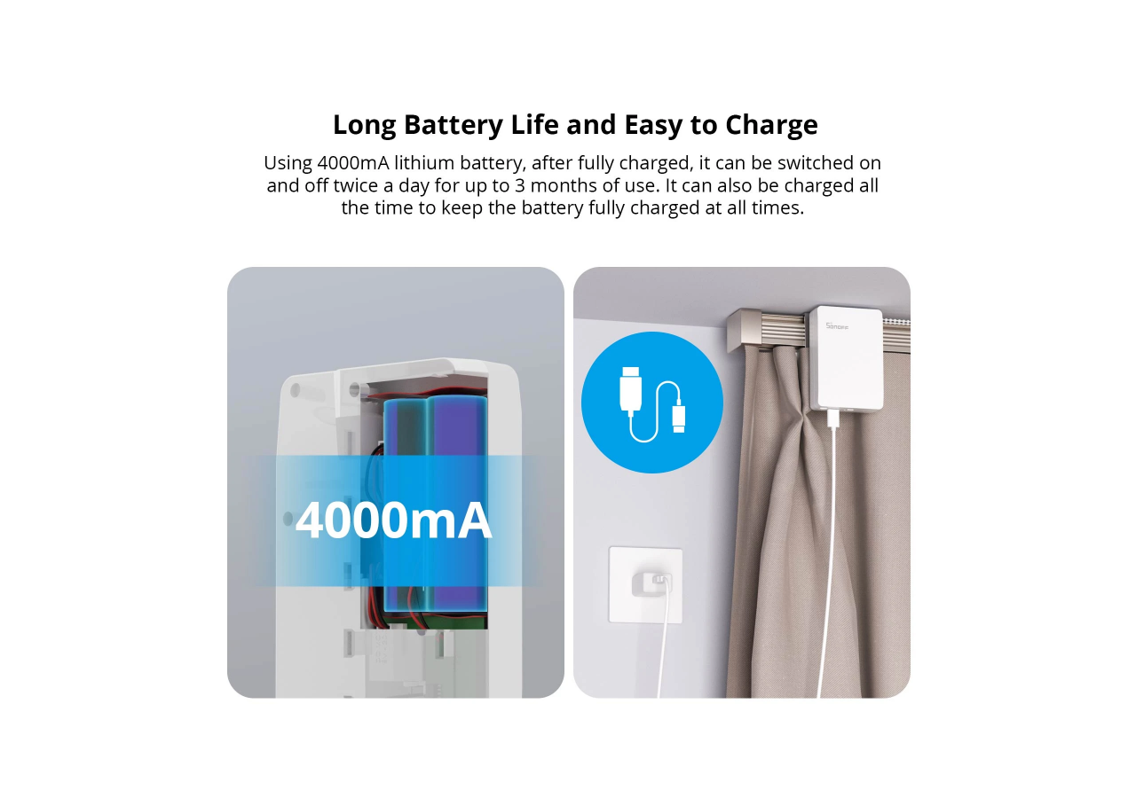 La batterie au lithium de 4000mA offre une grande autonomie et est facile à charger. Une fois complètement chargée, elle peut allumer et éteindre les rideaux deux fois par jour pendant trois mois d'utilisation. De plus, le moteur peut être rechargé à tout moment pour maintenir la batterie à pleine charge.