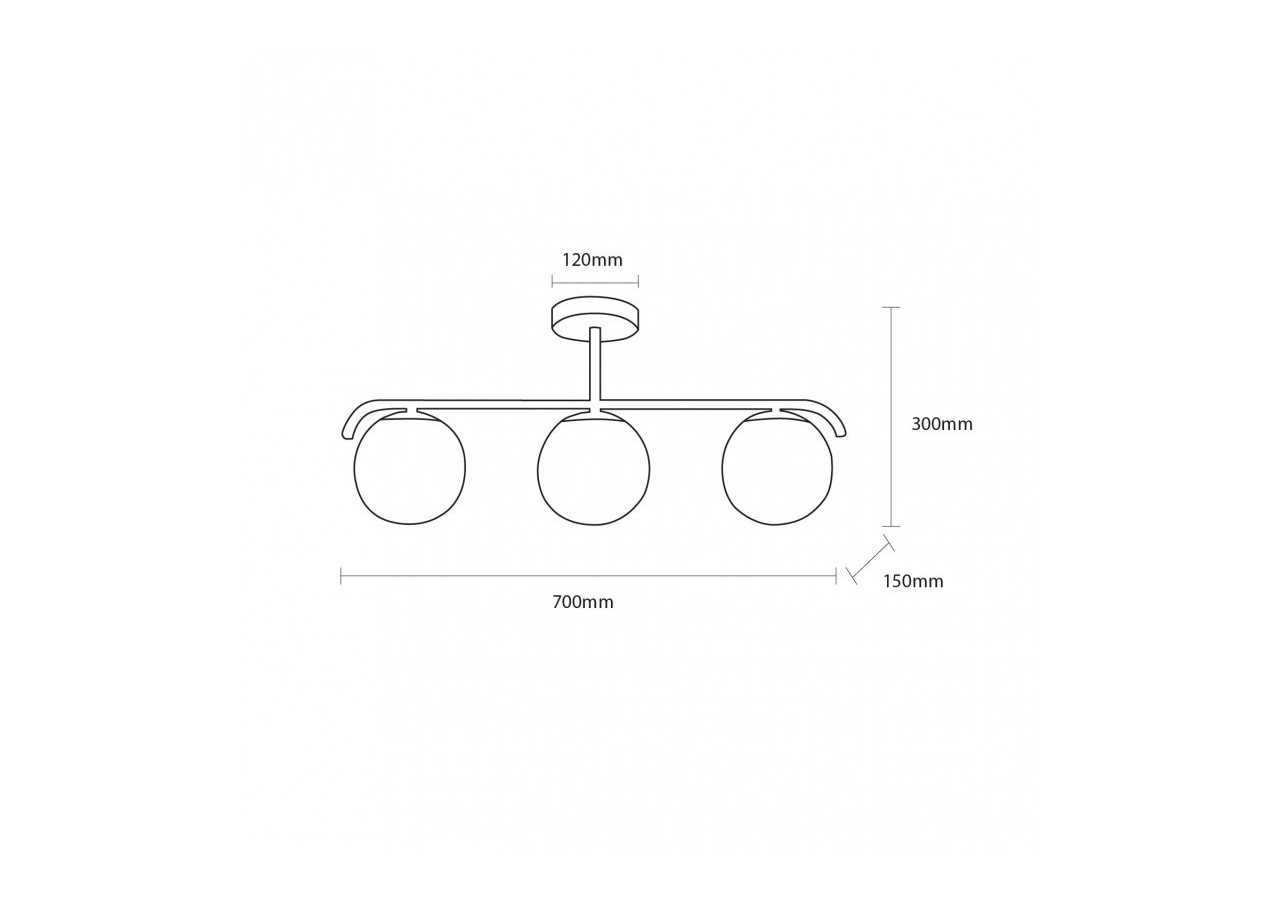 Le plafonnier "Talí" présente une structure en laiton doré, élégamment reliée à une rosace centrale, accompagnée de trois abat-jours sphériques en verre opale à haute transmission lumineuse, offrant un éclairage lumineux et uniforme.