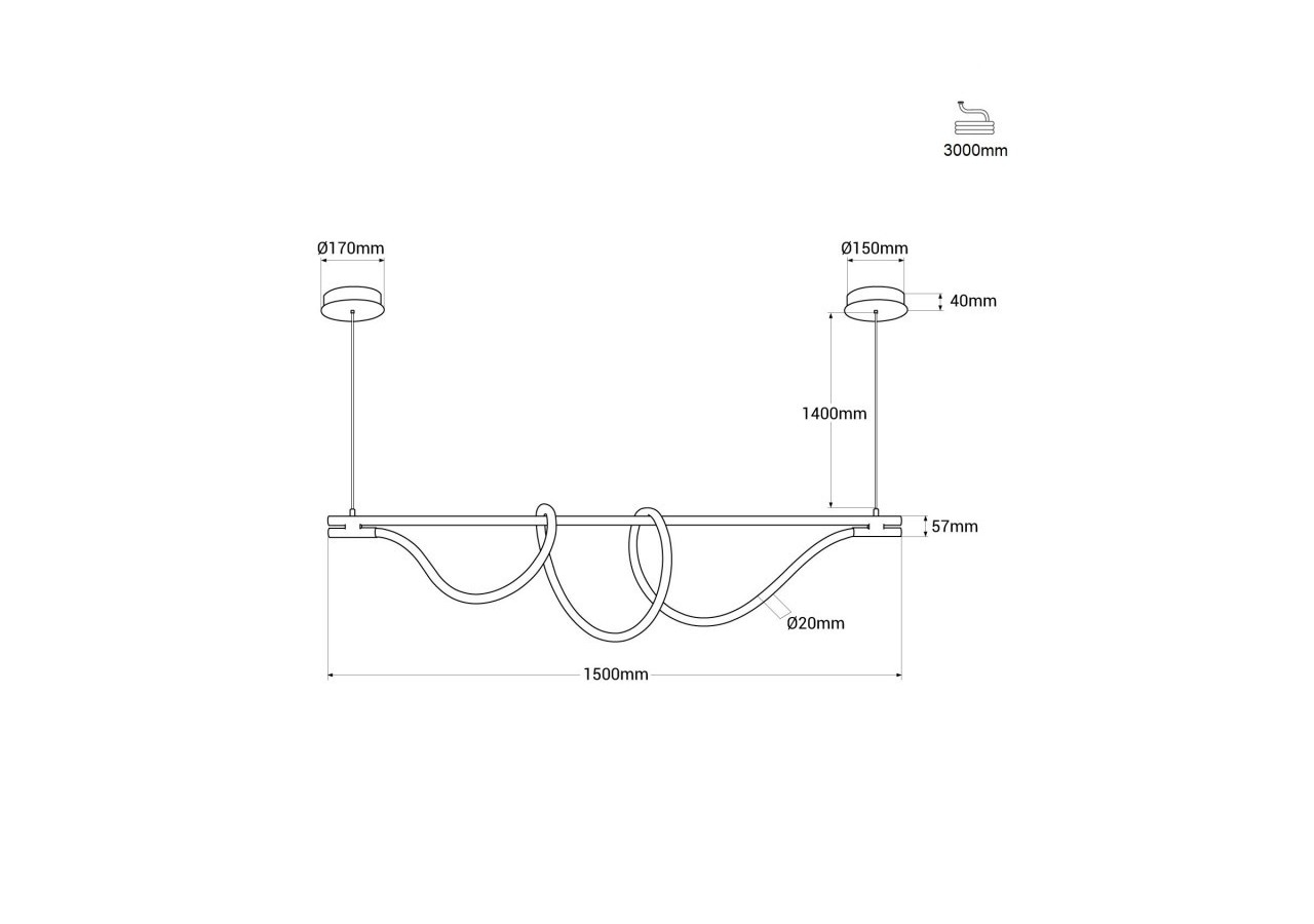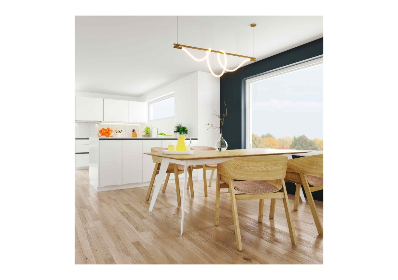 Son installation est simple et tous les éléments nécessaires sont inclus. Sa structure linéaire est solidement soutenue par deux câbles en acier plastifié, chacun d'eux étant fixé au plafond à l'aide d'une rosace.