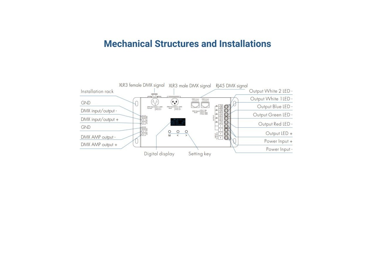 Le décodeur DMX512D est compatible avec trois types de ports DMX (borne verte, XLR3 et RJ45) et est conforme à la norme DMX512.