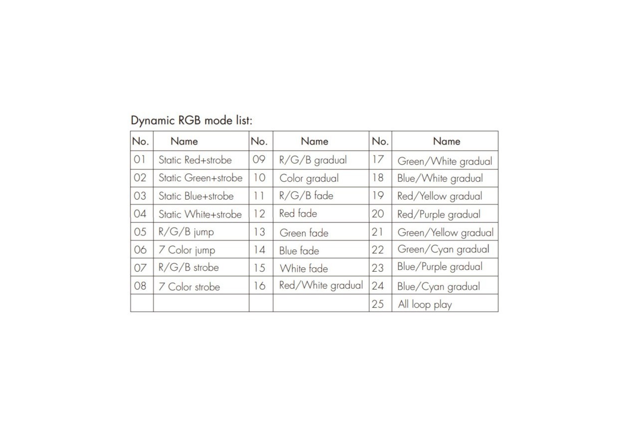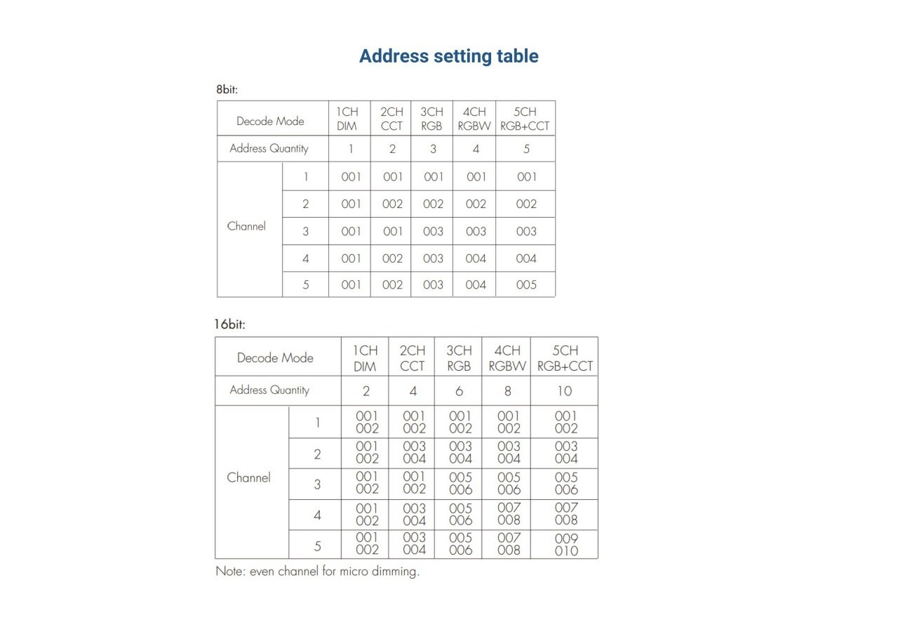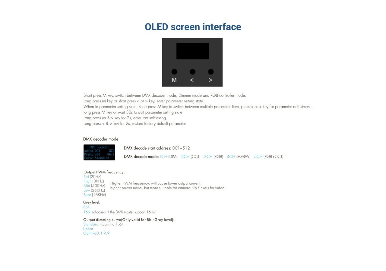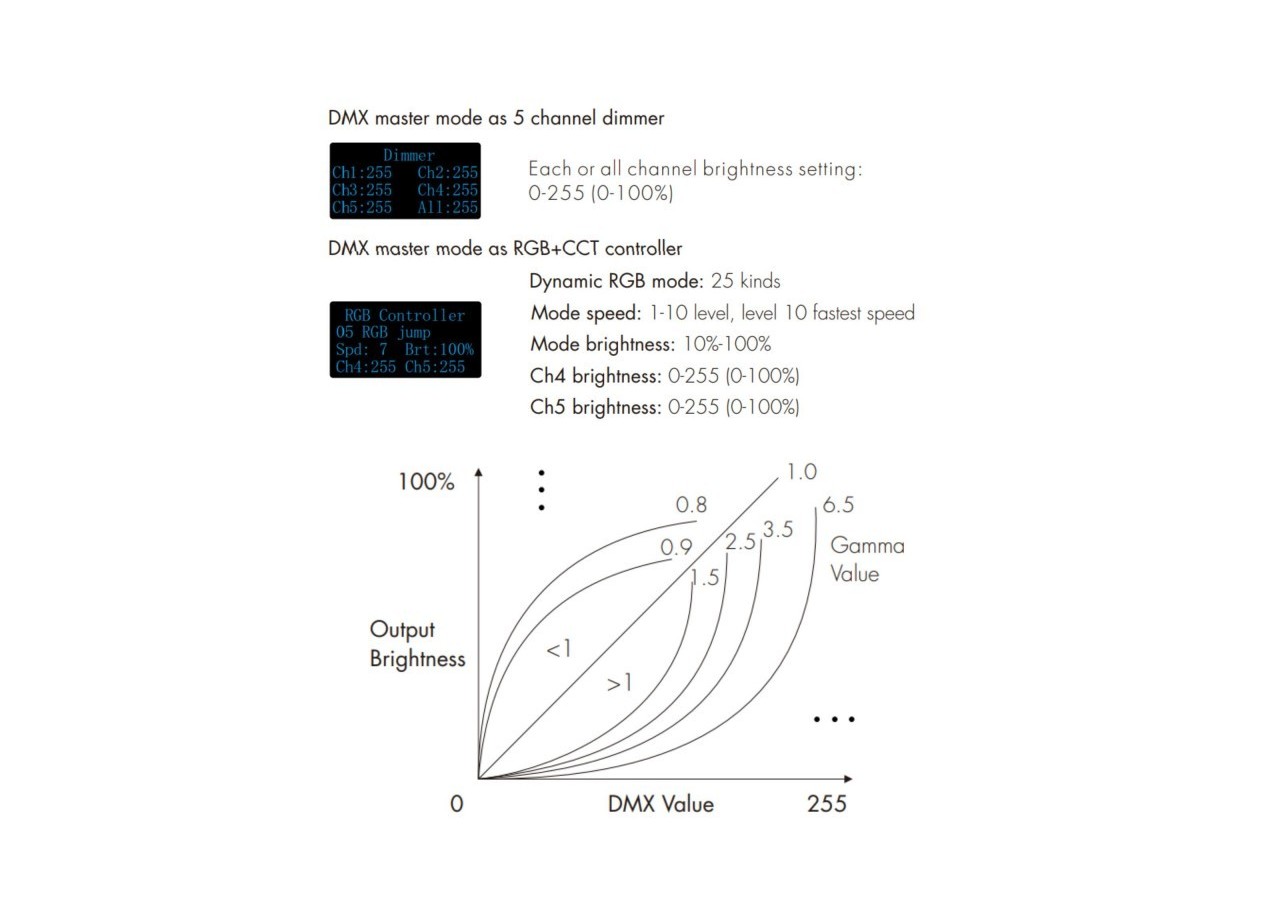 Il offre une gamme étendue de fonctionnalités, comprenant des modes de décodage de 1 à 5 canaux, divers réglages de fréquence PWM, la sélection des niveaux de gris en 8 bits ou 16 bits, ainsi que la possibilité d'ajuster la courbe de gradation. De plus, il inclut des modes de gradation RGB et 5 canaux autonomes, ainsi que 25 programmes RGB intégrés pour des effets d'éclairage impressionnants.