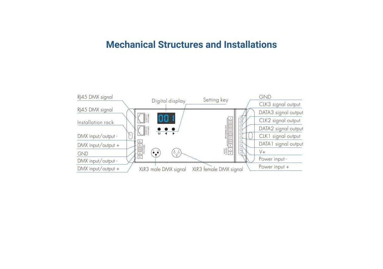 - Mode décodage DMX : Conforme à la norme DMX512, ce mode permet de régler l'adresse de départ DMX en utilisant les boutons dédiés.