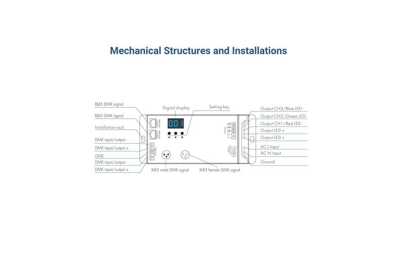 Il est compatible avec trois types de ports DMX (borne verte, XLR3 et RJ45) et est conforme à la norme DMX512.