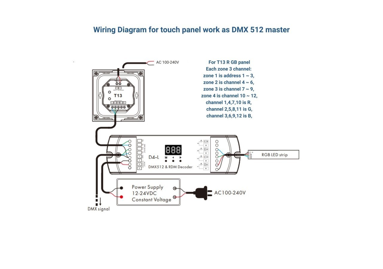 Le panneau de contrôle tactile DMX RGB présente un design élégant en blanc et offre une double fonctionnalité : il peut être utilisé en tant que maître DMX512 ou en tant que télécommande RF.