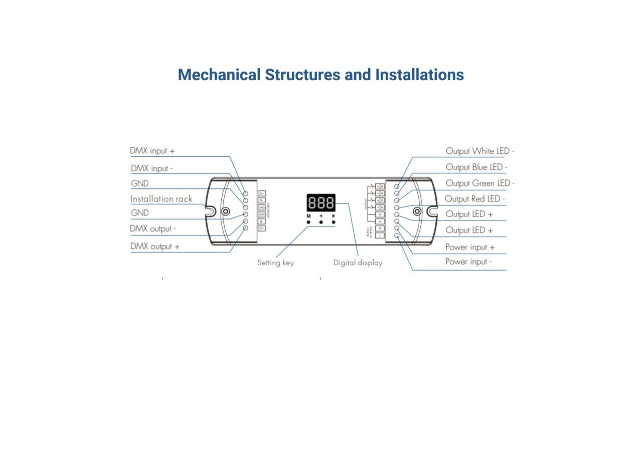 Ce décodeur offre une flexibilité exceptionnelle avec des modes de décodage de 1 à 4 canaux, ainsi que la possibilité de choisir parmi différentes fréquences PWM. Vous avez également la possibilité de sélectionner des niveaux de gris de 8 ou 16 bits et d'ajuster la courbe de gradation selon vos préférences. De plus, il intègre des modes de gradation autonomes RGB / RGW et 4 canaux, pouvant être contrôlés directement grâce à des boutons intégrés et des programmes prédéfinis, ce qui vous permet de l'utiliser sans nécessiter un signal DMX externe.
