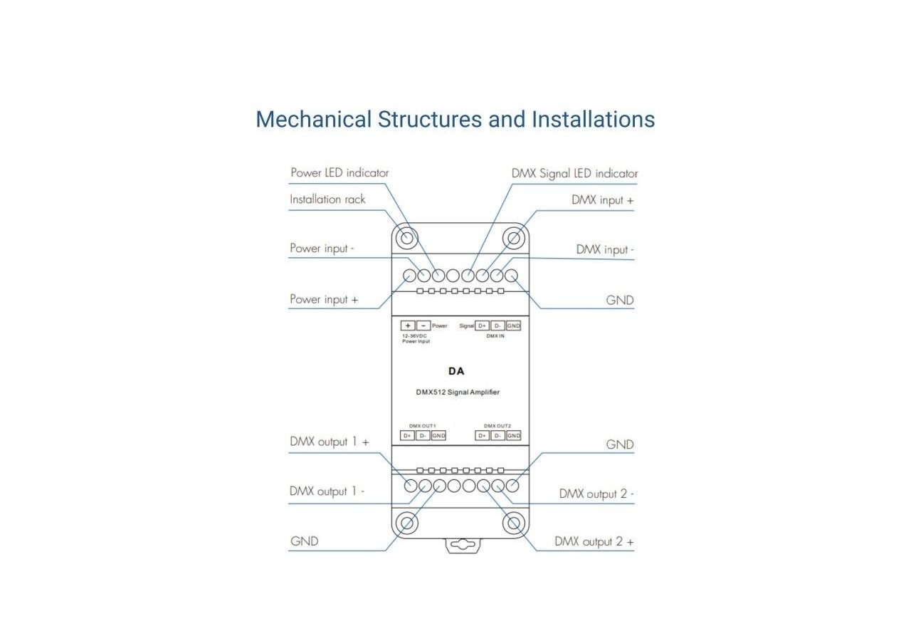 De plus, grâce à sa fonction d'isolation photo-électrique, cet amplificateur protège les équipements précieux tels que les luminaires, les dispositifs de communication RS-485, les contrôleurs DMX et les contrôleurs d'éclairage numériques contre les dommages potentiels résultant de connexions incorrectes ou de surtensions. Il contribue également à éliminer les interférences entre les équipements DMX connectés, assurant ainsi un fonctionnement sans heurts de votre système d'éclairage et de contrôle.