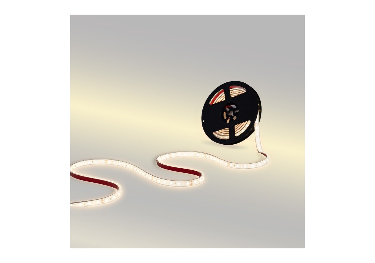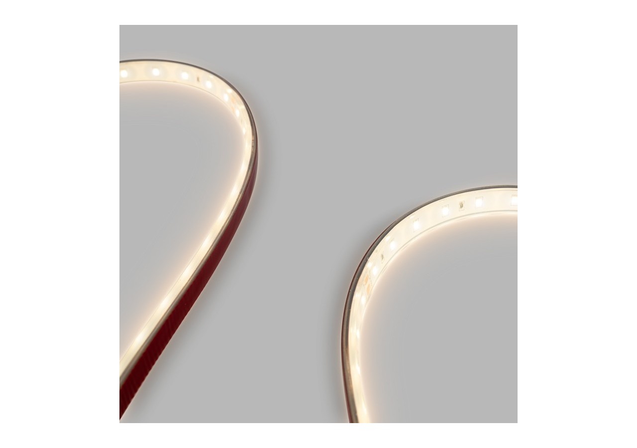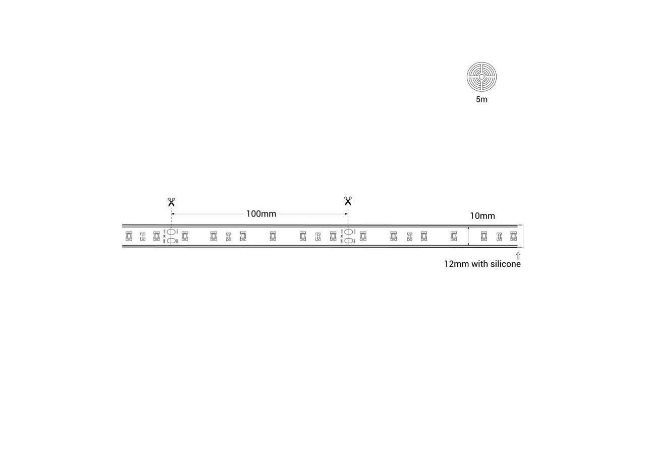 Ce ruban LED est livré sur un rouleau de 5 mètres, et des coupes peuvent être réalisées tous les 10 cm en suivant les marquages indiqués. La largeur totale de la bande est de 12 mm, incluant la couche de silicone (largeur de la piste : 10 mm). De plus, il est équipé d'un support autocollant qui simplifie son application sur la surface de votre choix.