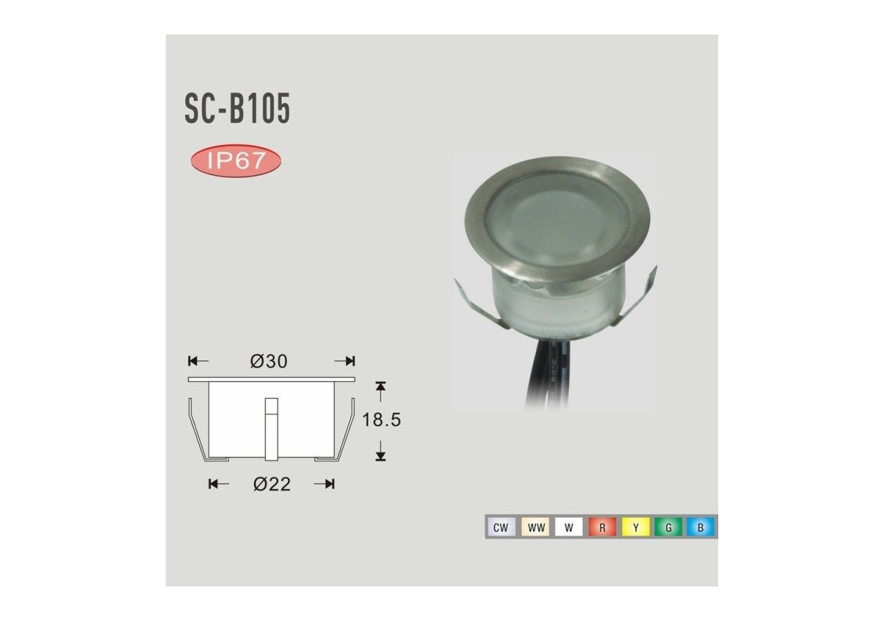 Dimensions de notre spot encastrable de sol : ø 30mm de diamètre et 18,5 de hauteur. Prévoir une découpe de ø 22mm.