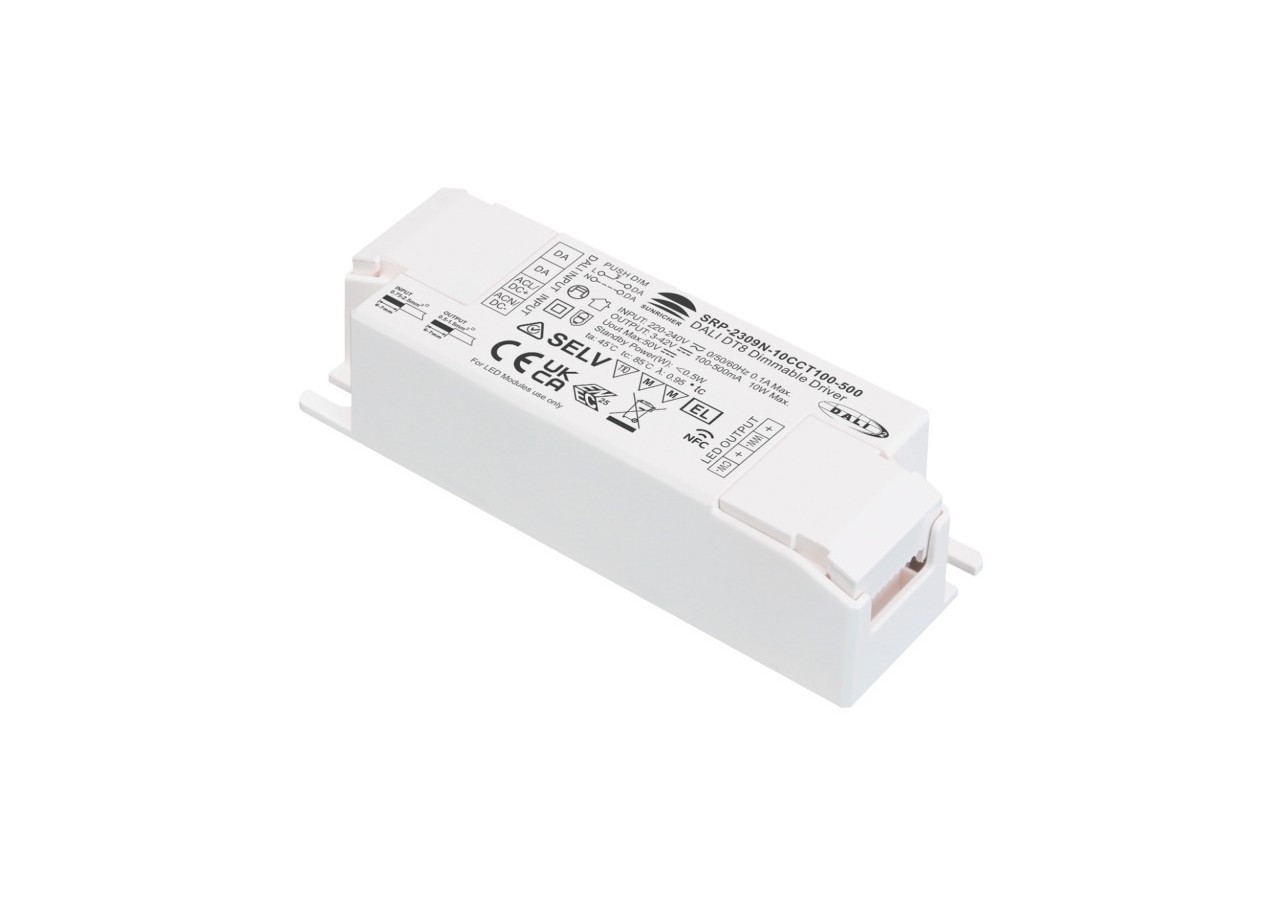 Certifié DALI-2, il est équipé d'une interface DALI-2/Push intégrée, garantissant une communication fiable et précise. De plus, sa fonction NFC permet un réglage précis du courant de sortie, avec des incréments de 0,1 mA dans une plage de 100 à 500 mA.
