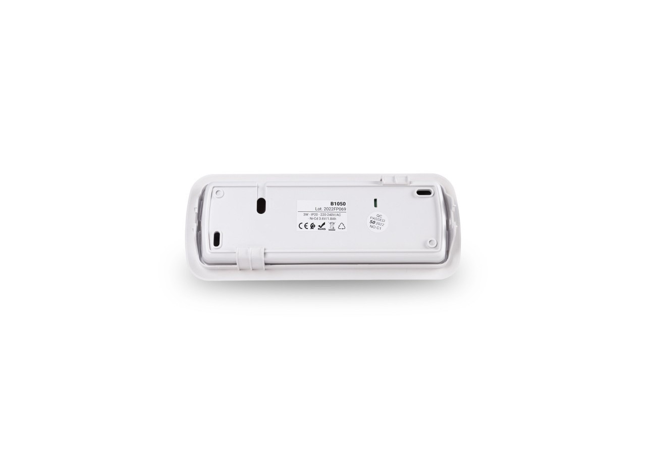Le luminaire a une puissance de 3W et produit une luminosité de 250 lumens. Il est équipé d'un système d'allumage automatique qui se met en marche en cas de panne d'électricité, offrant une autonomie pouvant atteindre jusqu'à 3 heures d'éclairage d'urgence.