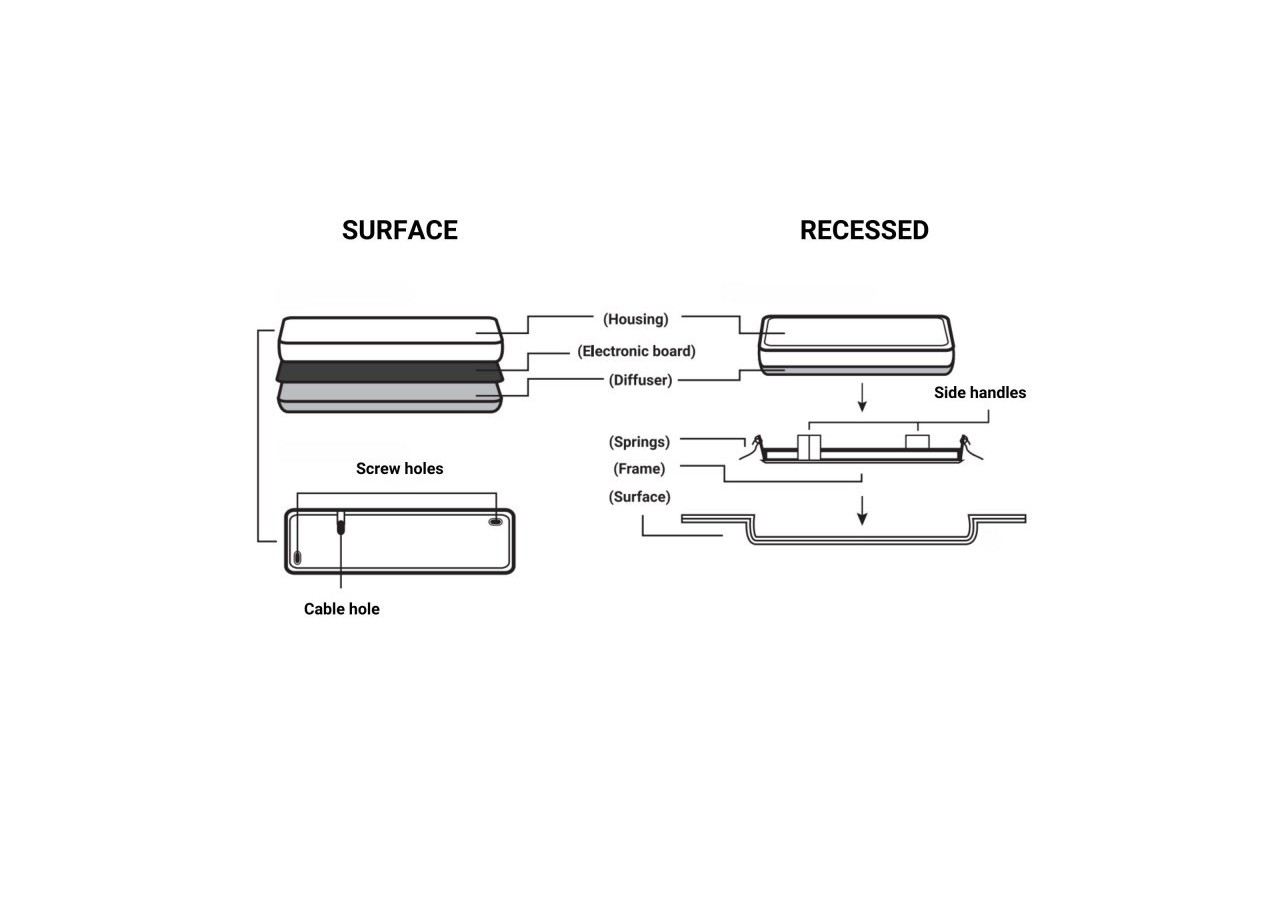 En surface :Il peut également être installé rapidement et simplement en le fixant au mur ou au plafond tout en raccordant les câbles nécessaires. Il est important de retirer le cadre du luminaire conçu pour une installation encastrée avant de procéder à l'installation en surface.