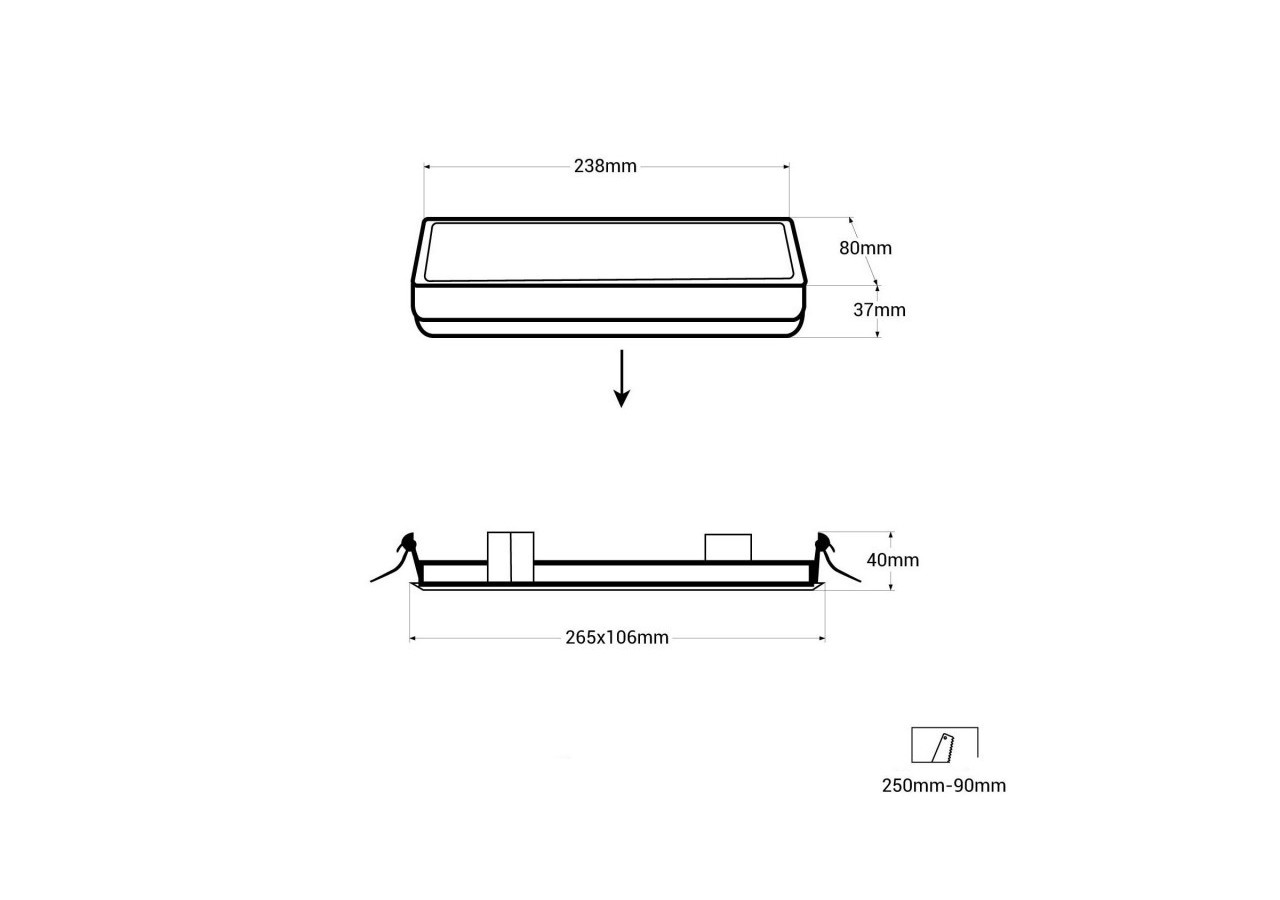 Encastré :Vous pouvez le mettre en place en remplaçant un ancien luminaire ou en faisant un nouveau trou. Après avoir réalisé la découpe nécessaire et connecté le câblage, le luminaire s'insère facilement et se fixe en place à l'aide de ses deux ailettes latérales.