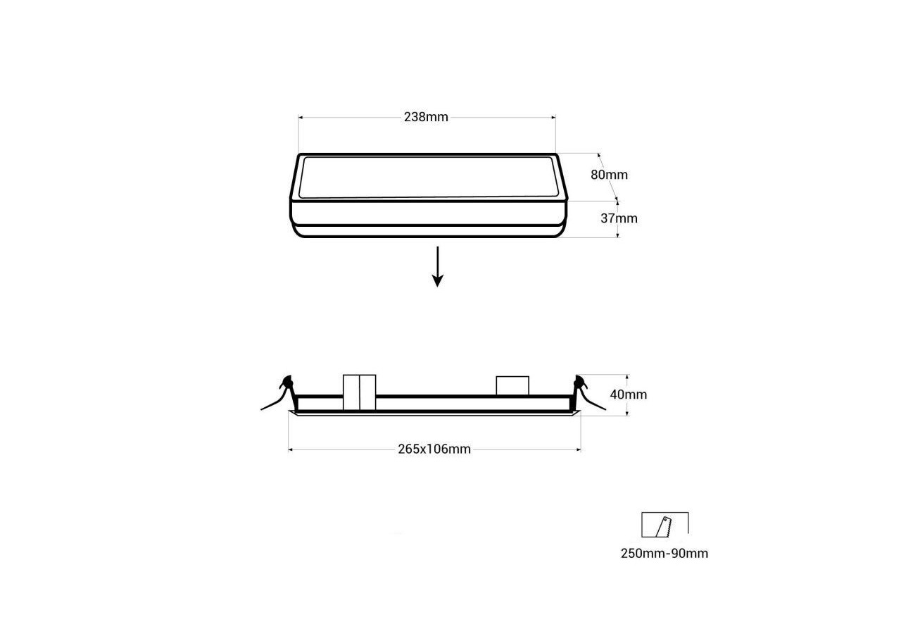 Encastré :Vous pouvez le mettre en place en remplaçant un ancien luminaire ou en faisant un nouveau trou. Après avoir réalisé la découpe nécessaire et connecté le câblage, le luminaire s'insère facilement et se fixe en place à l'aide de ses deux ailettes latérales.