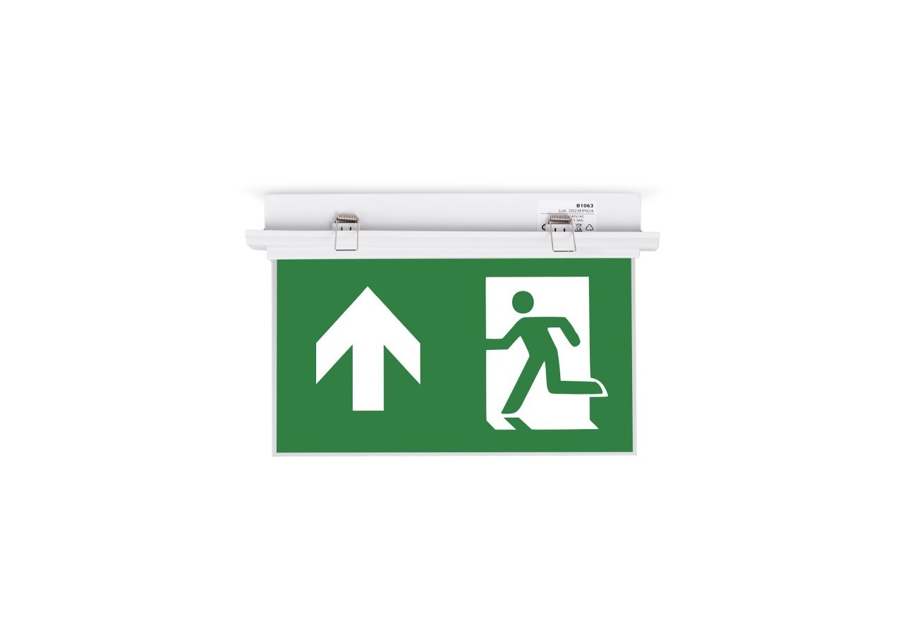 Elle est équipée de deux étiquettes en acétate identiques, faciles à fixer sur le luminaire, assurant une signalisation claire pour la localisation de la sortie de secours avec une flèche portant vers le haut,donnantune information claire et précise sur la direction à prendre en cas d’urgence