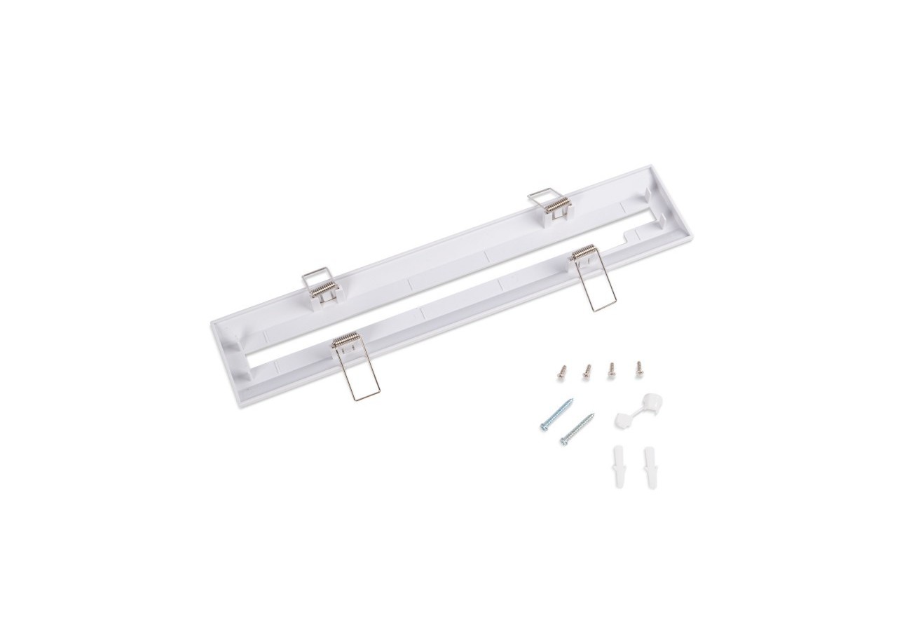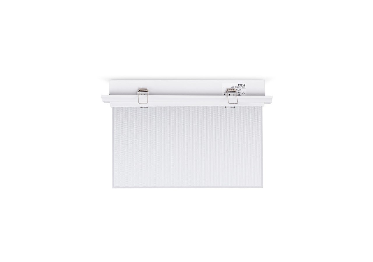 Ce luminaire de secours est conçu pour être encastré dans le plafond. Une fois les câbles coupés et raccordés, le luminaire est facilement inséré et fixé à l'aide de ses deux ailes latérales.