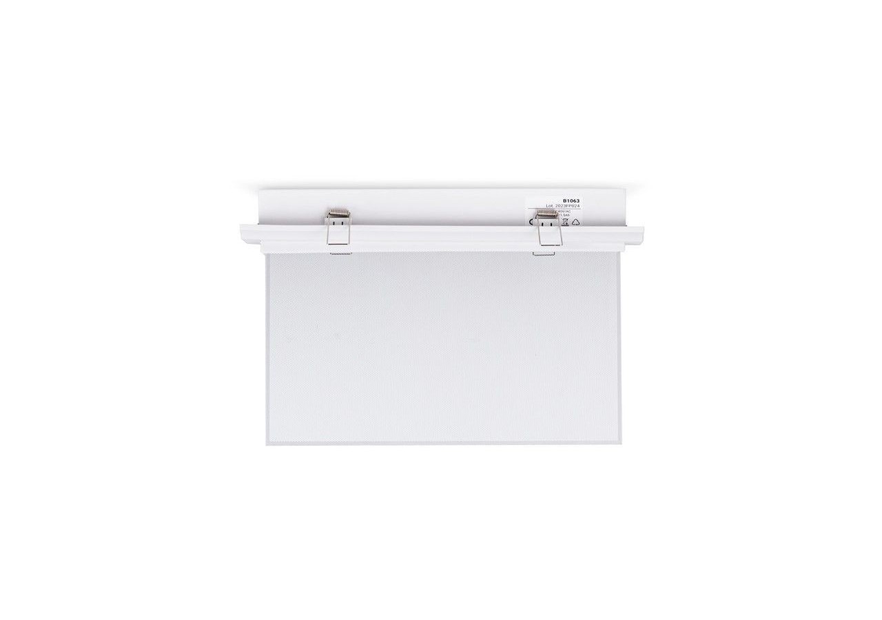 Ce luminaire de secours est conçu pour être encastré dans le plafond. Une fois les câbles coupés et raccordés, le luminaire est facilement inséré et fixé à l'aide de ses deux ailes latérales.