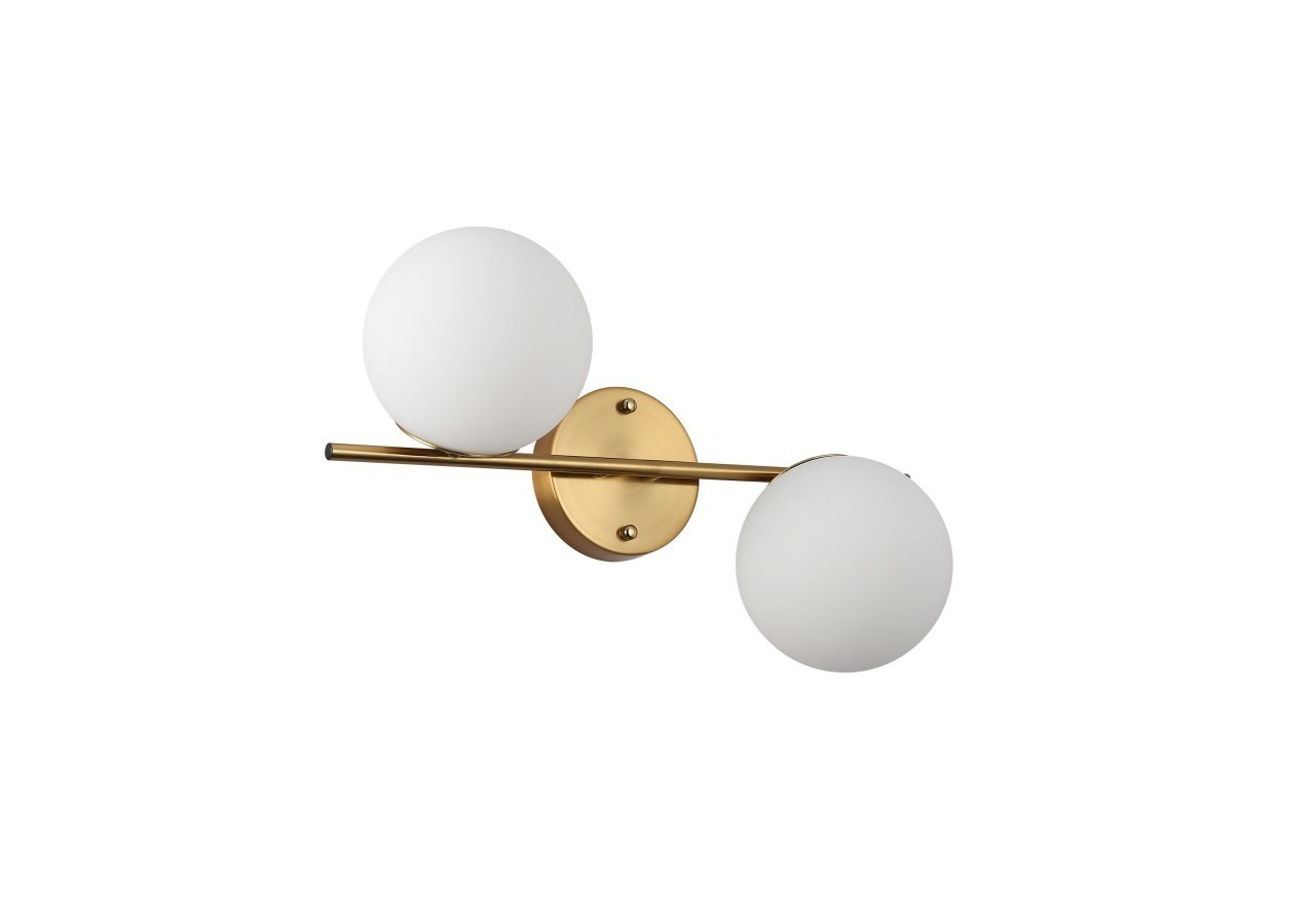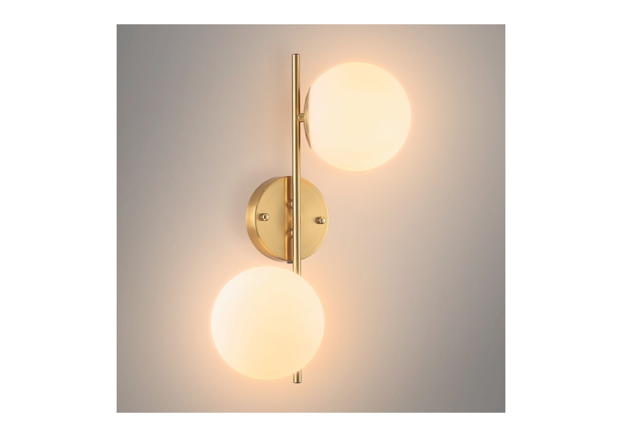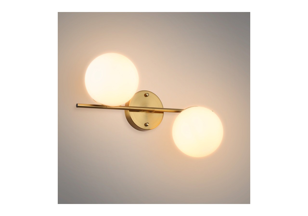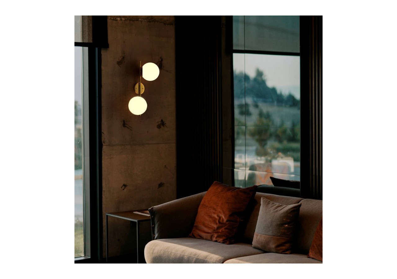 L'applique se distingue par une rosace et une structure en aluminium, disponible dans une finition dorée, sur laquelle reposent deux globes en verre opale à haute transmission lumineuse. Ces verrines en forme de boule confèrent à l'ensemble une légèreté saisissante, créant l'illusion délicate qu'elles flottent avec grâce.