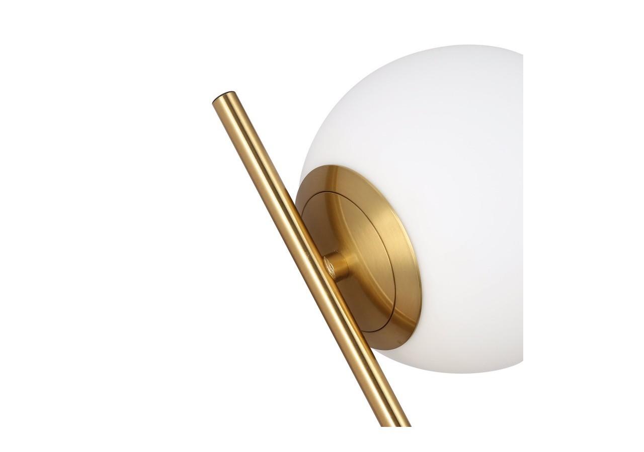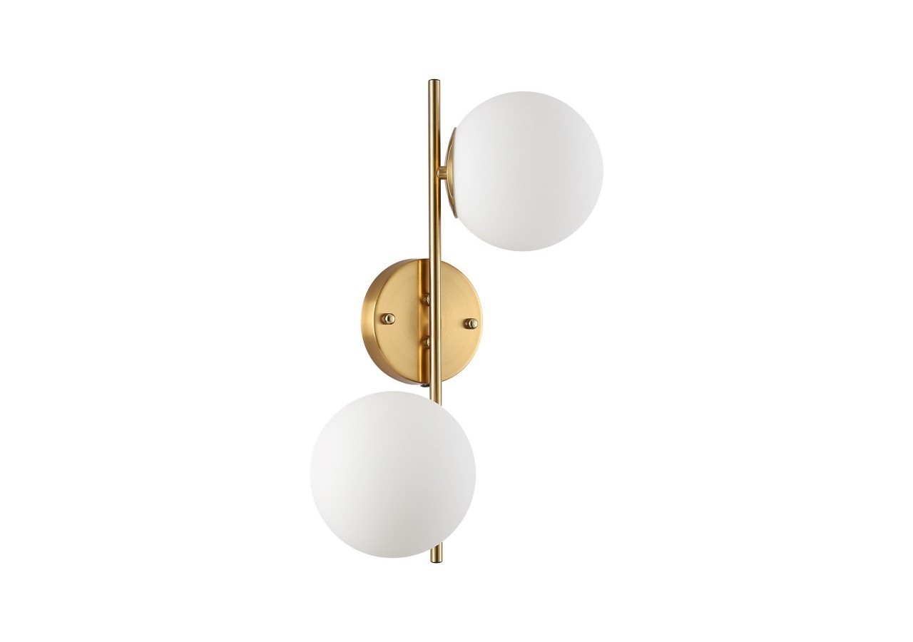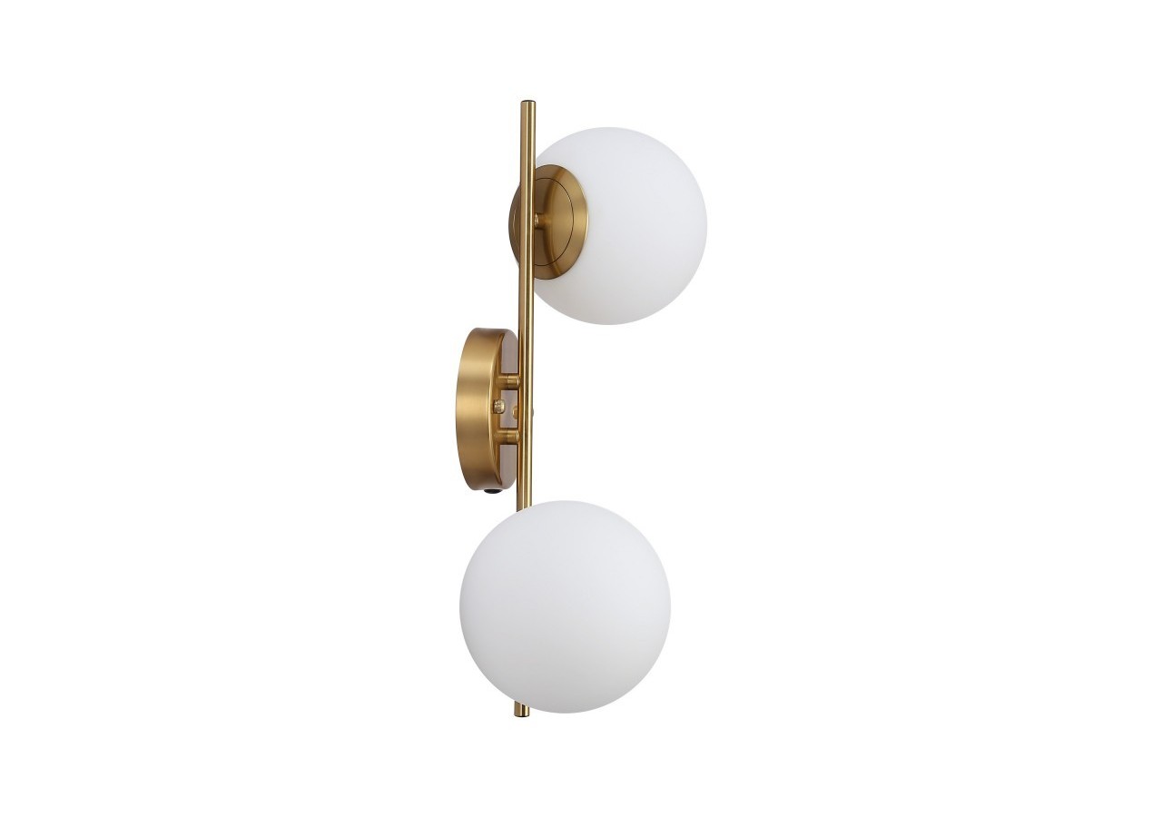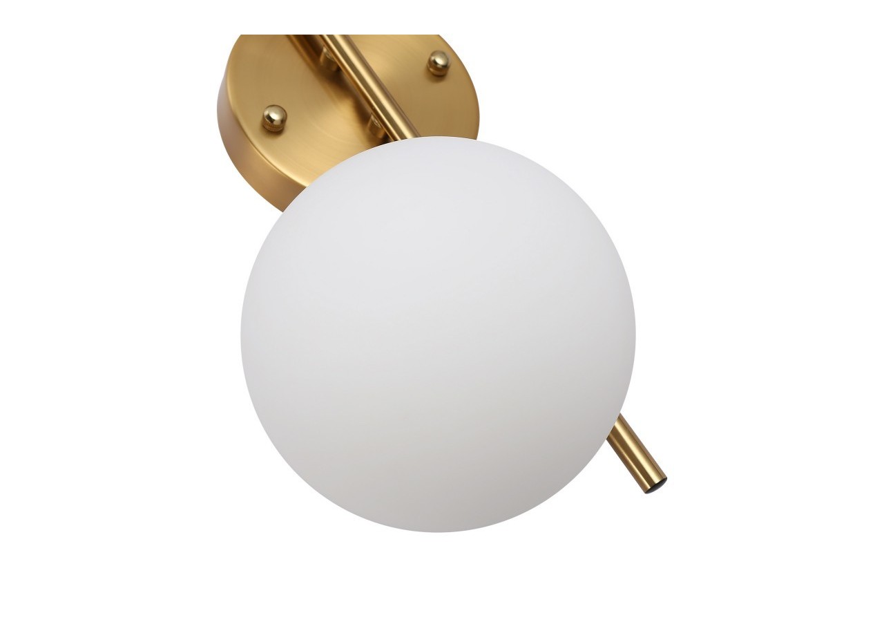 L'applique se distingue par une rosace et une structure en aluminium, disponible dans une finition dorée, sur laquelle reposent deux globes en verre opale à haute transmission lumineuse. Ces verrines en forme de boule confèrent à l'ensemble une légèreté saisissante, créant l'illusion délicate qu'elles flottent avec grâce.