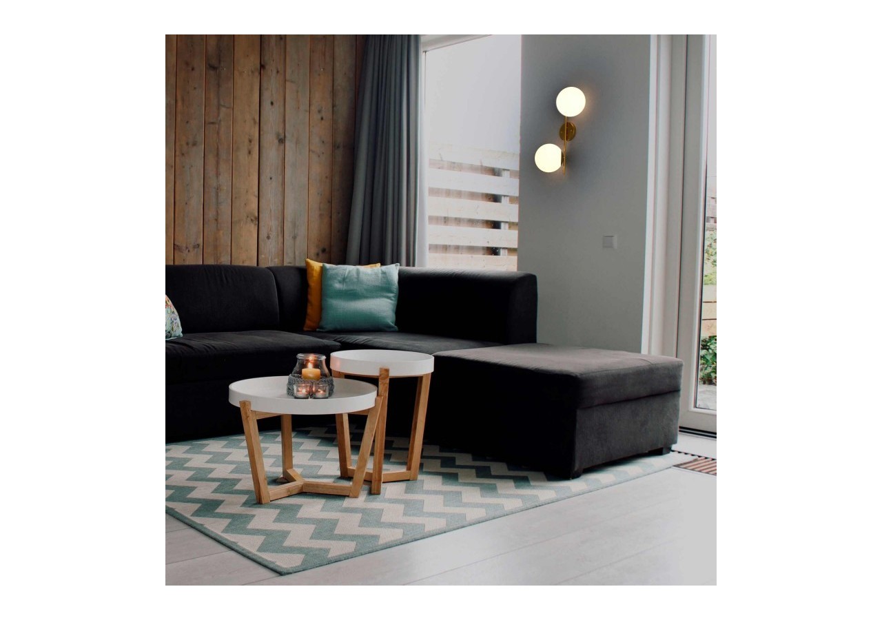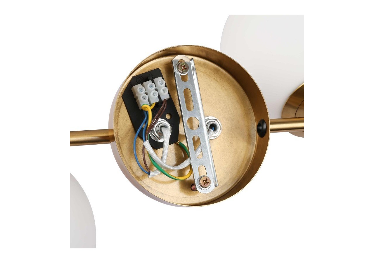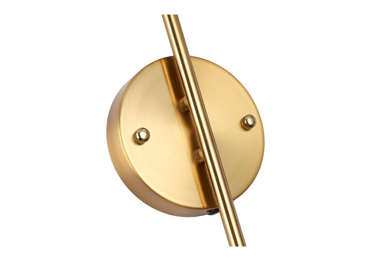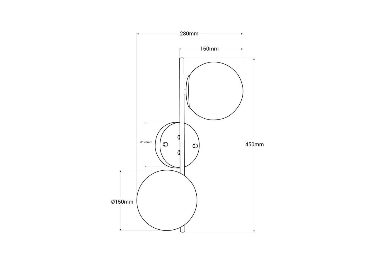 L'applique se distingue par une rosace et une structure en aluminium, disponible dans une finition dorée, sur laquelle reposent deux globes en verre opale à haute transmission lumineuse. Ces verrines en forme de boule confèrent à l'ensemble une légèreté saisissante, créant l'illusion délicate qu'elles flottent avec grâce.