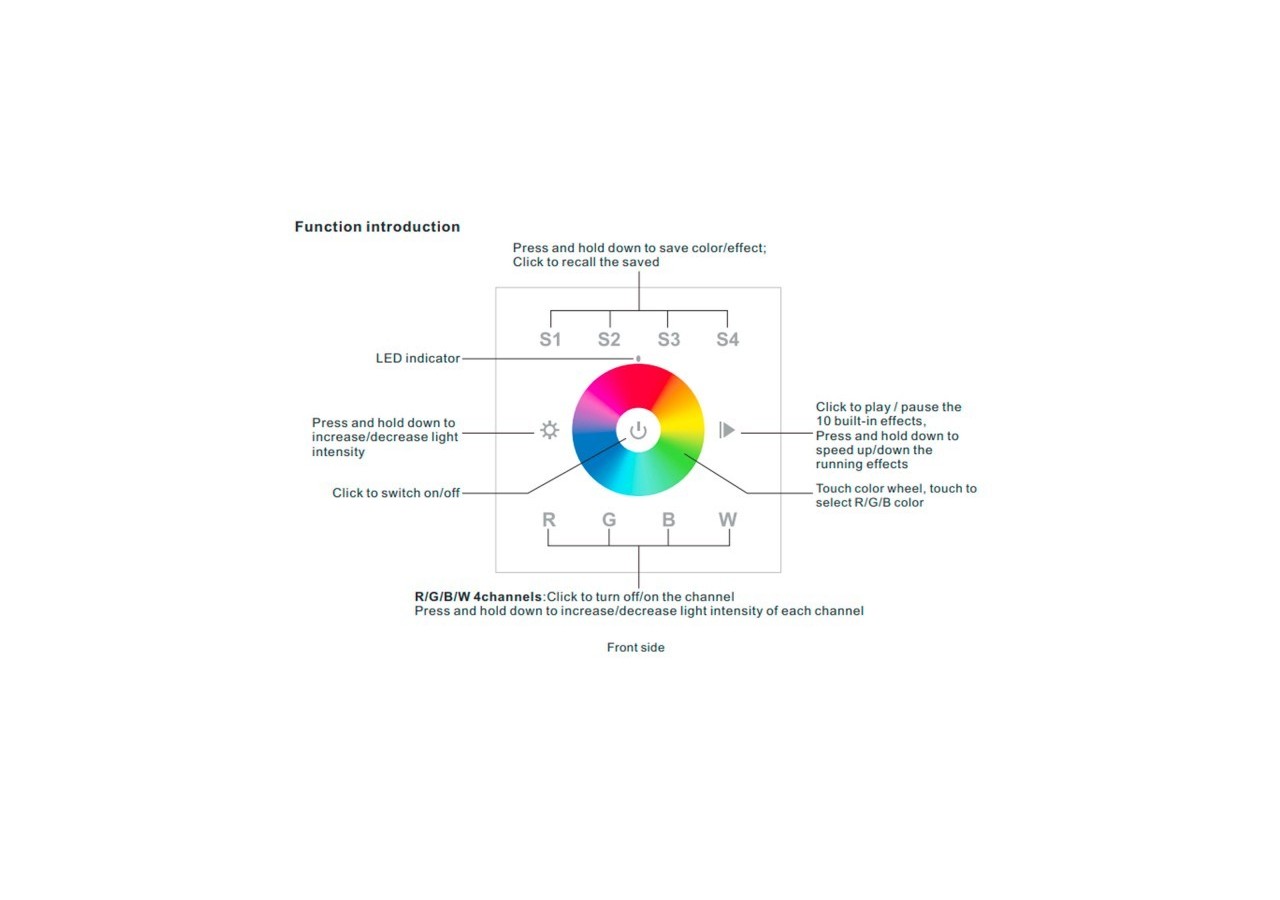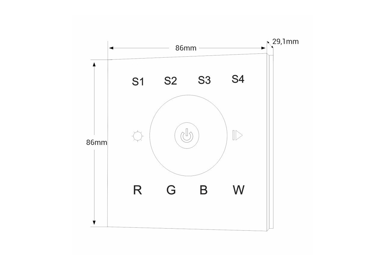 La télécommande tactile Sunricher se distingue par un design élégant en noir avec un panneau en verre ultra-sensible, offrant un réglage précis et intuitif de l'éclairage RGBW.