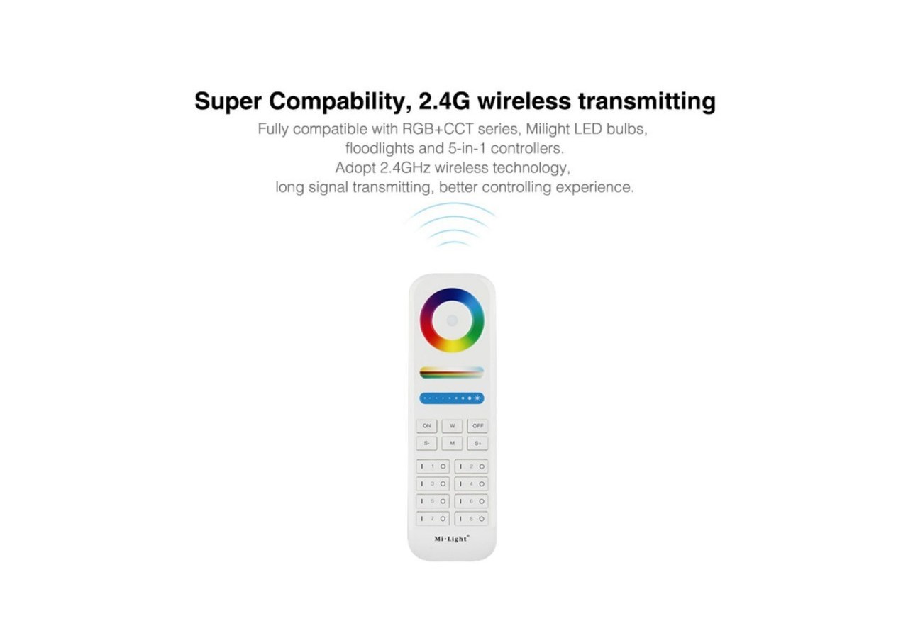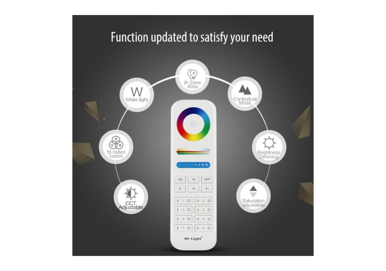Elle permet de gérer jusqu' à 8 zones distinctes et offre la possibilité de créer des groupes et des combinaisons personnalisées selon les besoins. à noter qu'un contrôleur "Mi-Light" est requis pour chaque zone à contrôler. En d'autres termes, pour contrôler 8 zones de manière indépendante, il faut disposer de 8 contrôleurs et d'une télécommande distincte pour chacune d'elles.