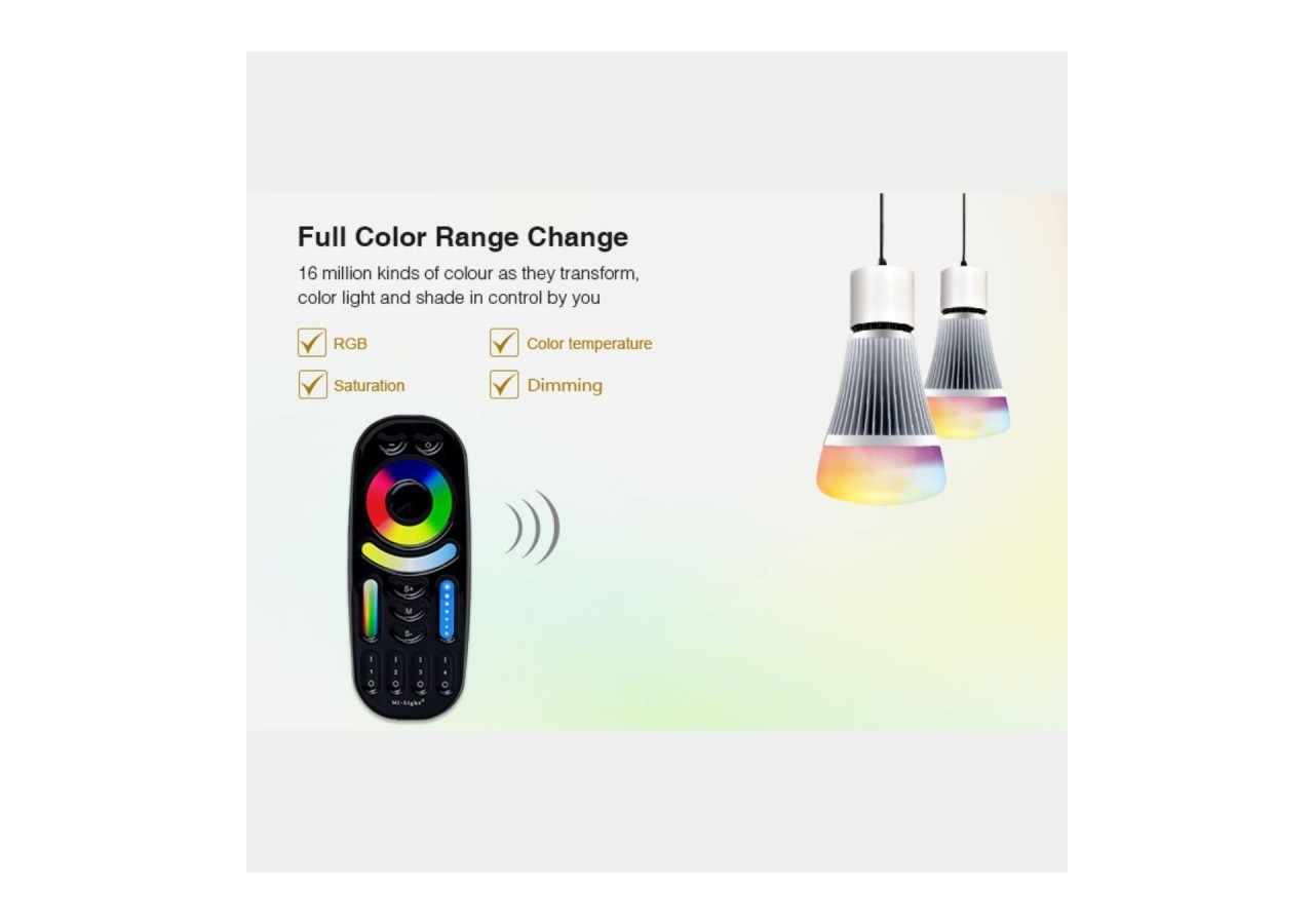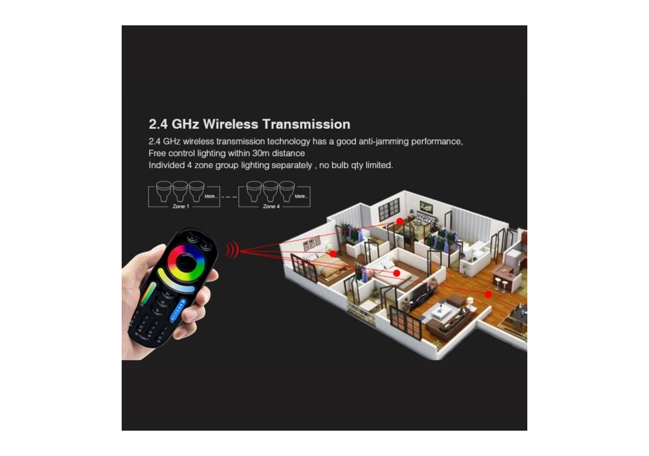 La télécommande sans fil RGB + CCT "Mi-Light" 4 zones fonctionne avec un récepteur RF opérant à la fréquence standard de 2,4 GHz, assurant une transmission du signal jusqu' à une distance de 30 mètres, même à travers les murs et les plafonds.