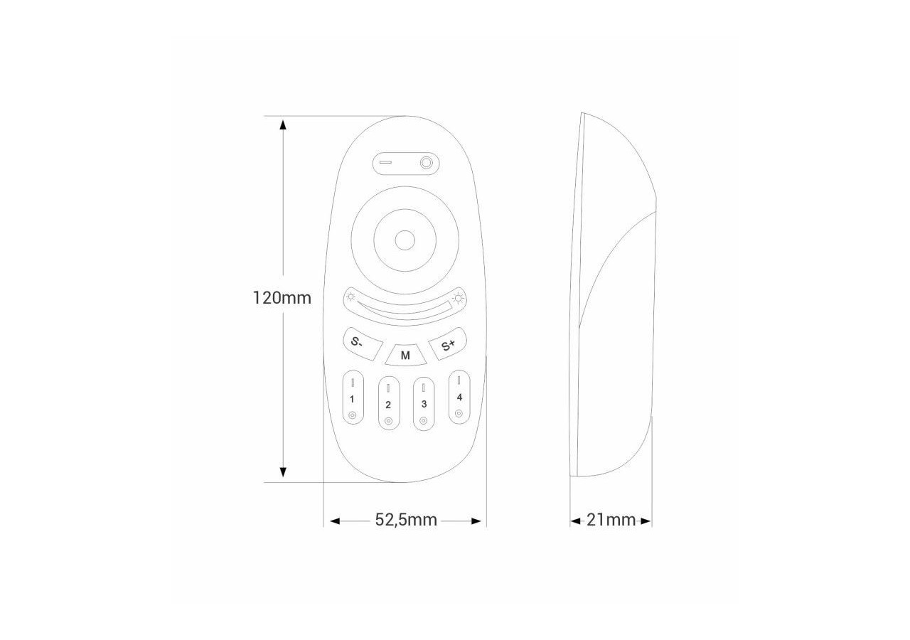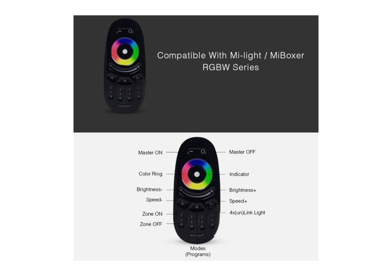 Cette télécommande permet de gérer jusqu' à 4 zones distinctes et offre la possibilité de créer des groupes et des combinaisons personnalisées selon les besoins. Il convient de noter qu'un contrôleur "Mi-Light" est requis pour chaque zone à contrôler. En d'autres termes, pour contrôler 4 zones de manière indépendante, 4 contrôleurs et une télécommande distincte sont nécessaires.