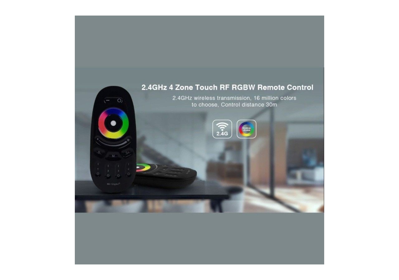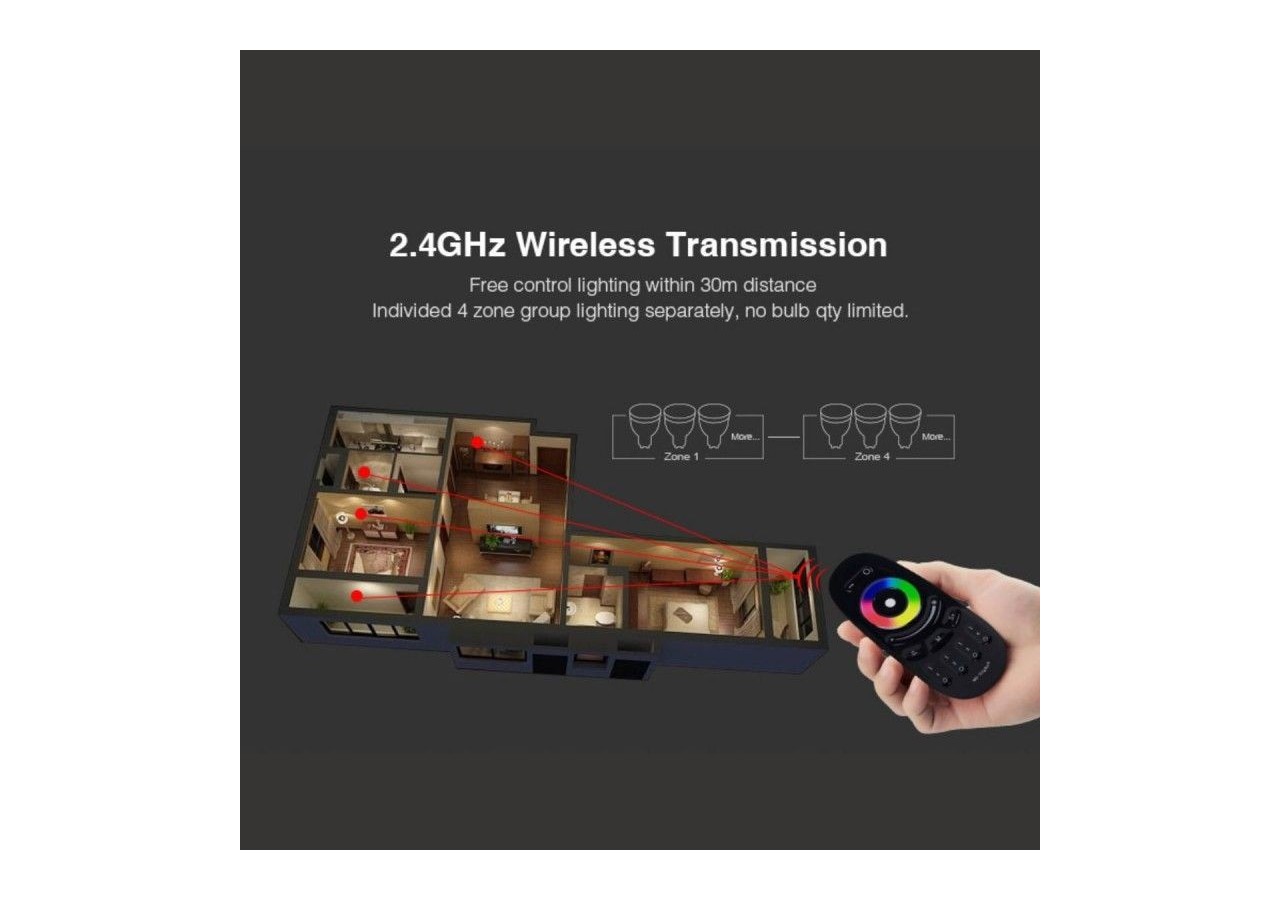 La télécommande sans fil RGBW "Mi-Light" 4 zones fonctionne en tandem avec un récepteur RF opérant à la fréquence standard de 2,4 GHz, permettant une transmission du signal jusqu' à une distance de 30 mètres, même à travers les murs et les plafonds.