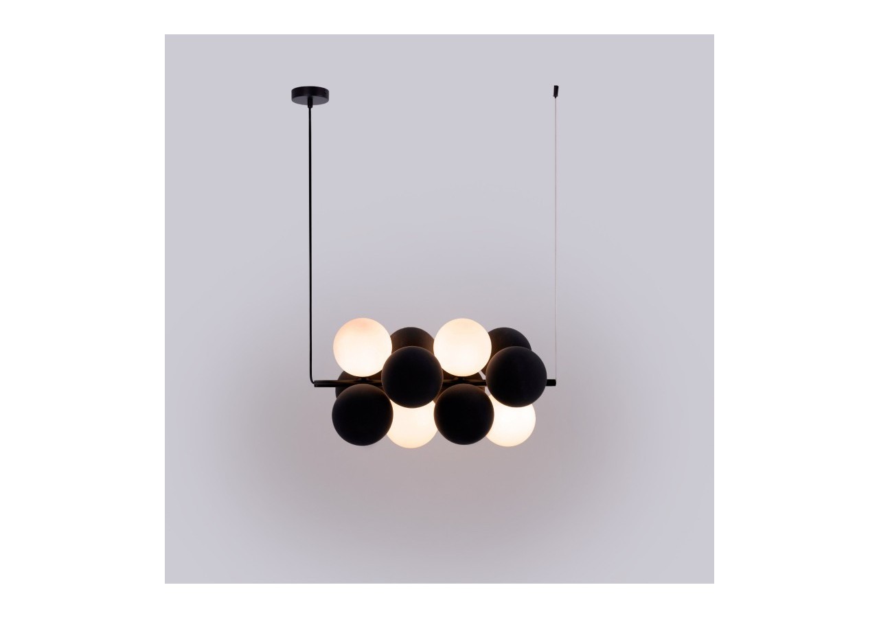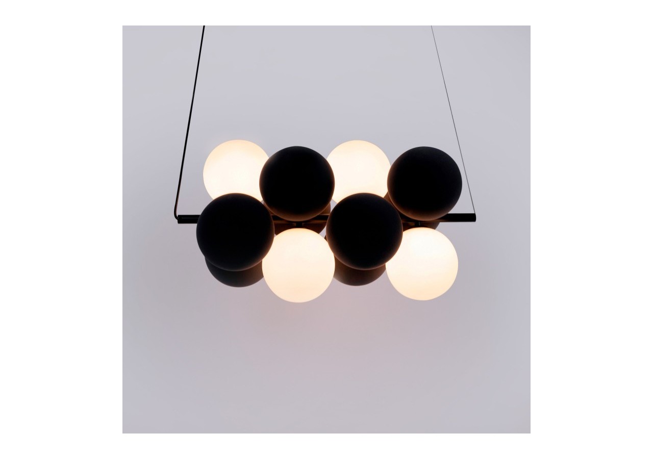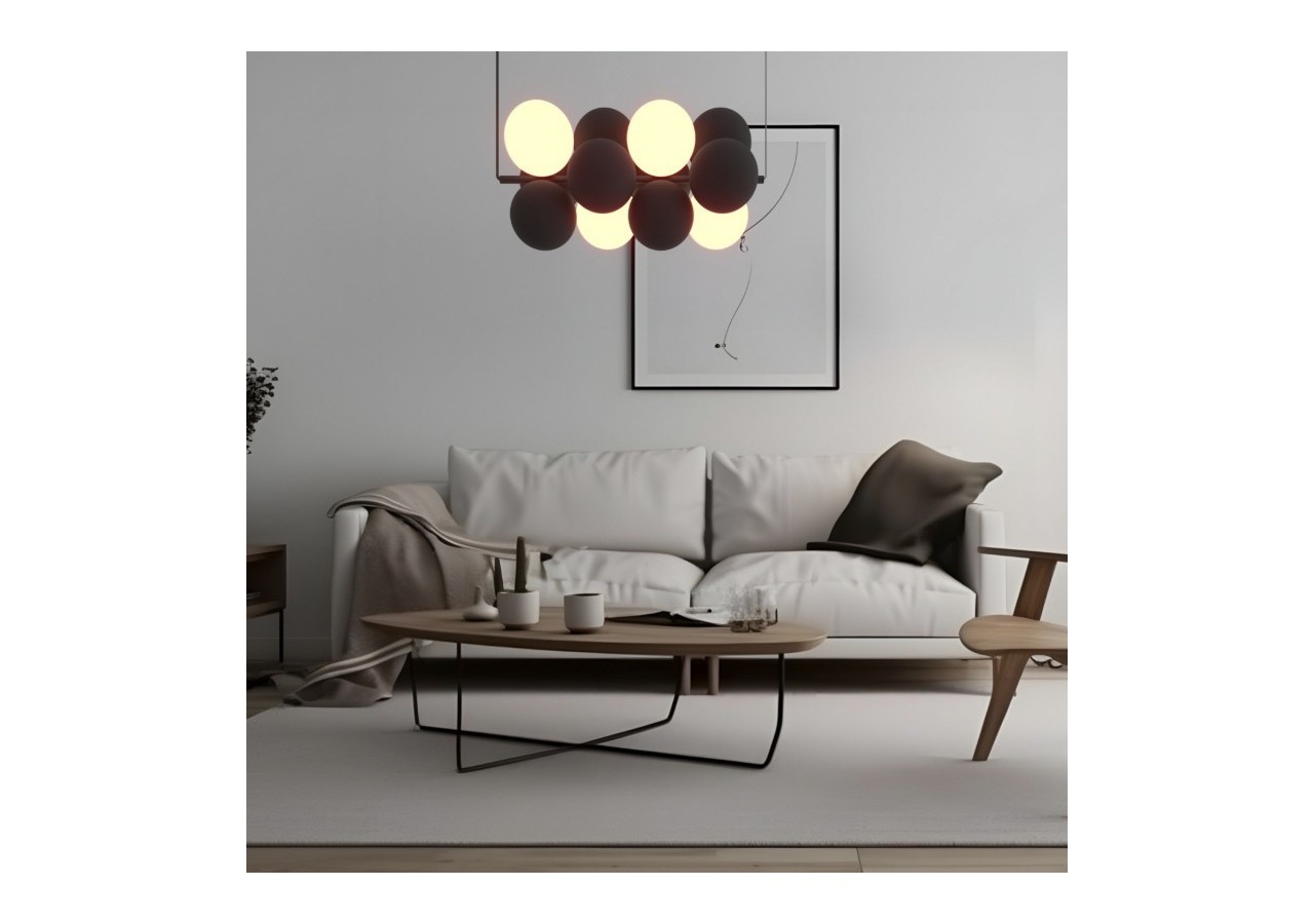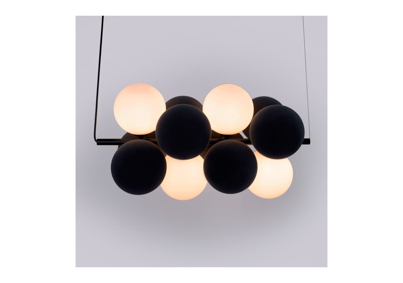 Les sphères lumineuses en verre opalin diffusent une lumière douce et enveloppante, créant une atmosphère décontractée et moderne. Le design horizontal permet une distribution uniforme de la lumière, soulignant l'élégance des formes abstraites et créant un jeu d'ombres fascinant.