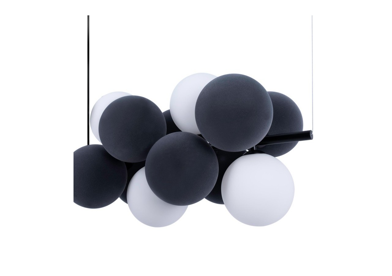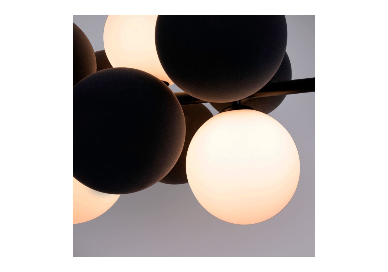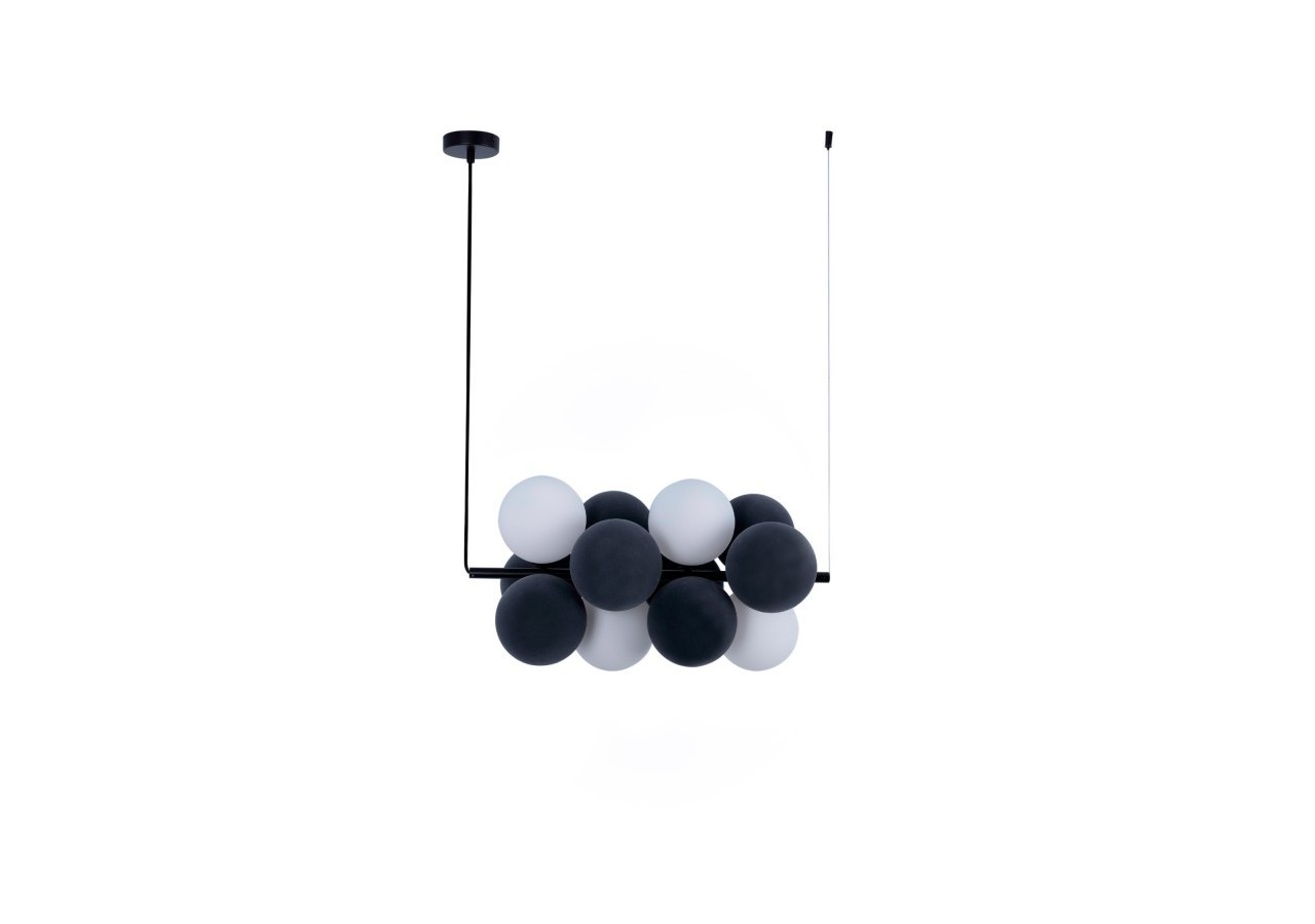 Les sphères lumineuses en verre opalin diffusent une lumière douce et enveloppante, créant une atmosphère décontractée et moderne. Le design horizontal permet une distribution uniforme de la lumière, soulignant l'élégance des formes abstraites et créant un jeu d'ombres fascinant.