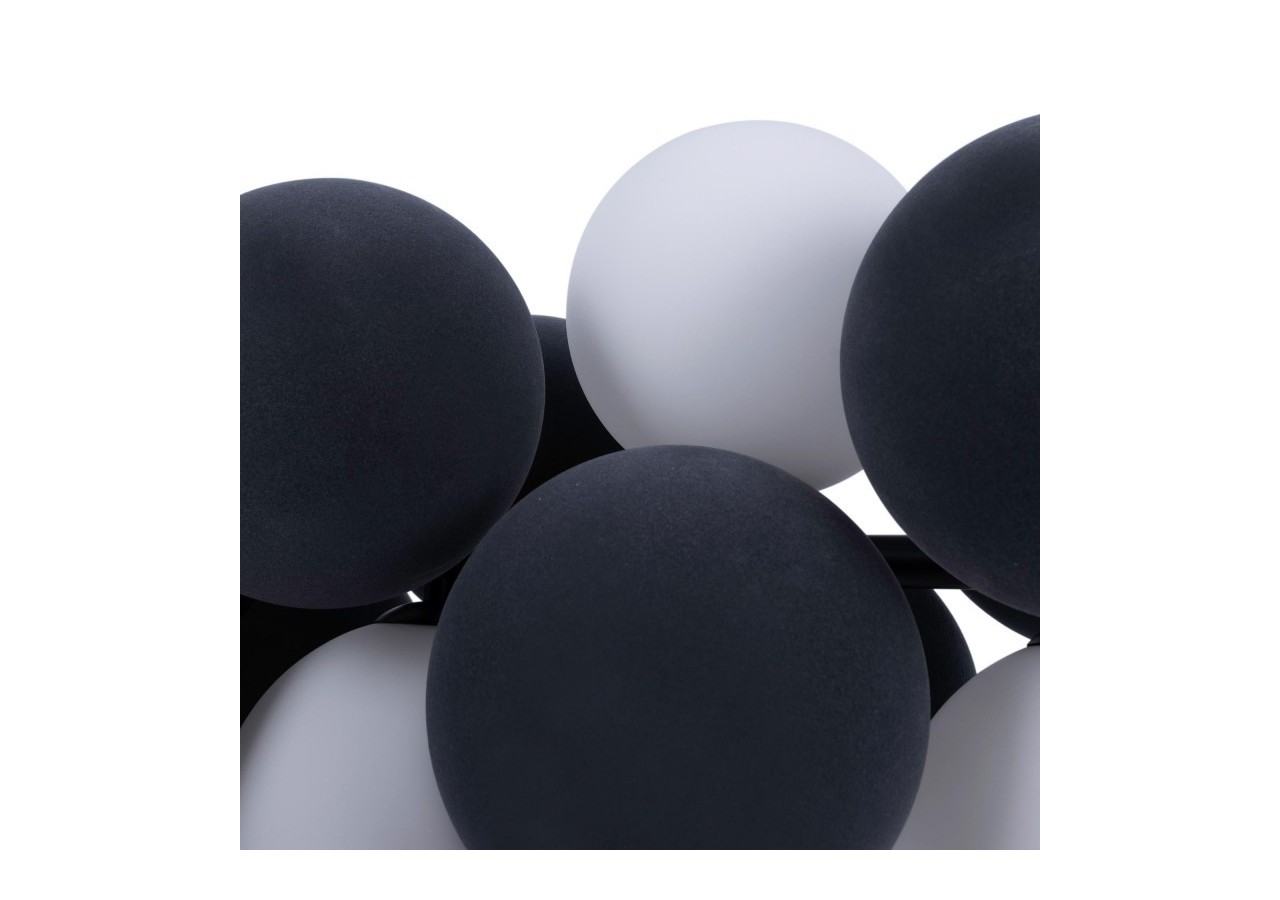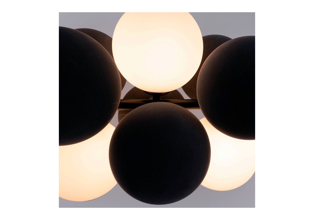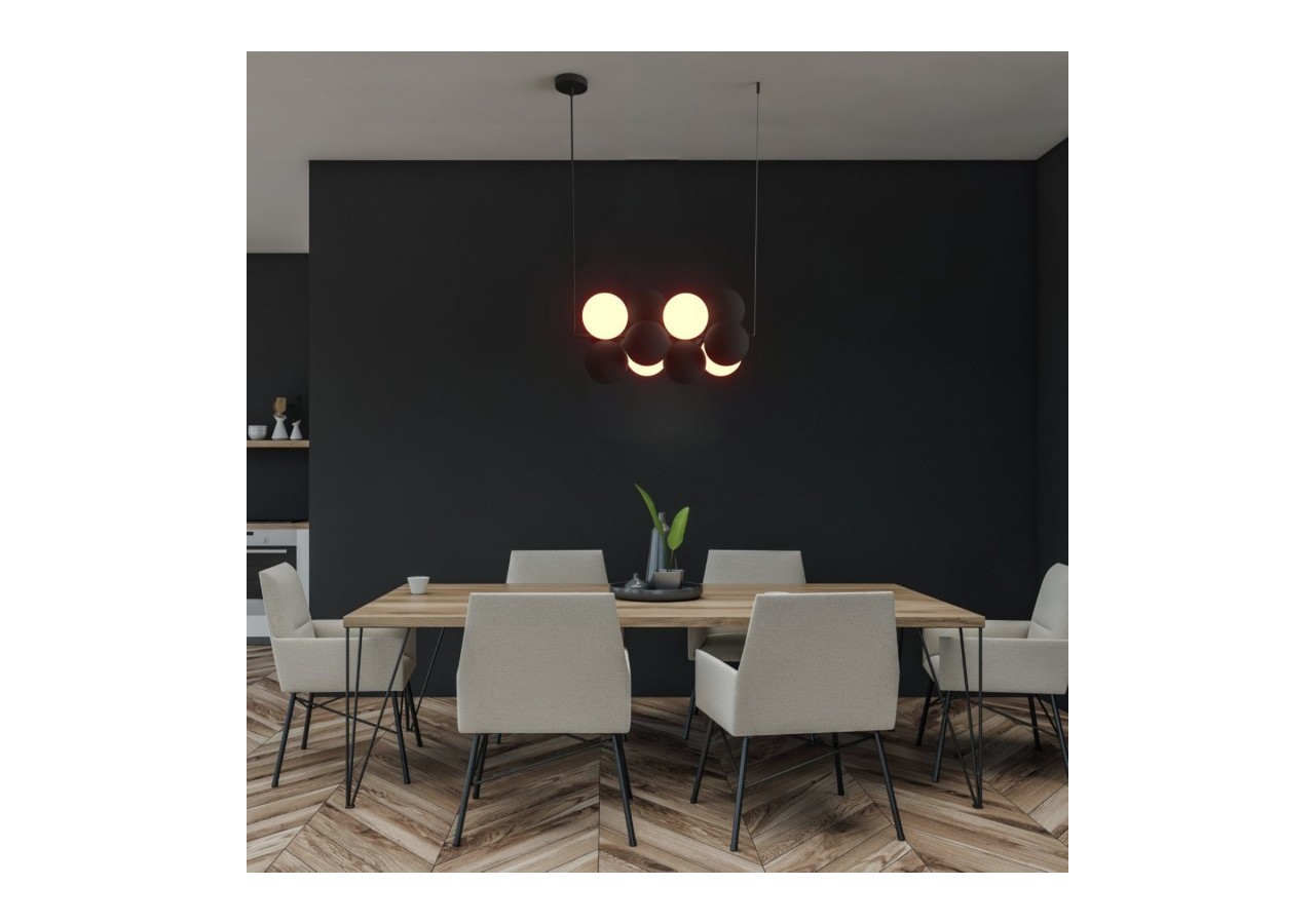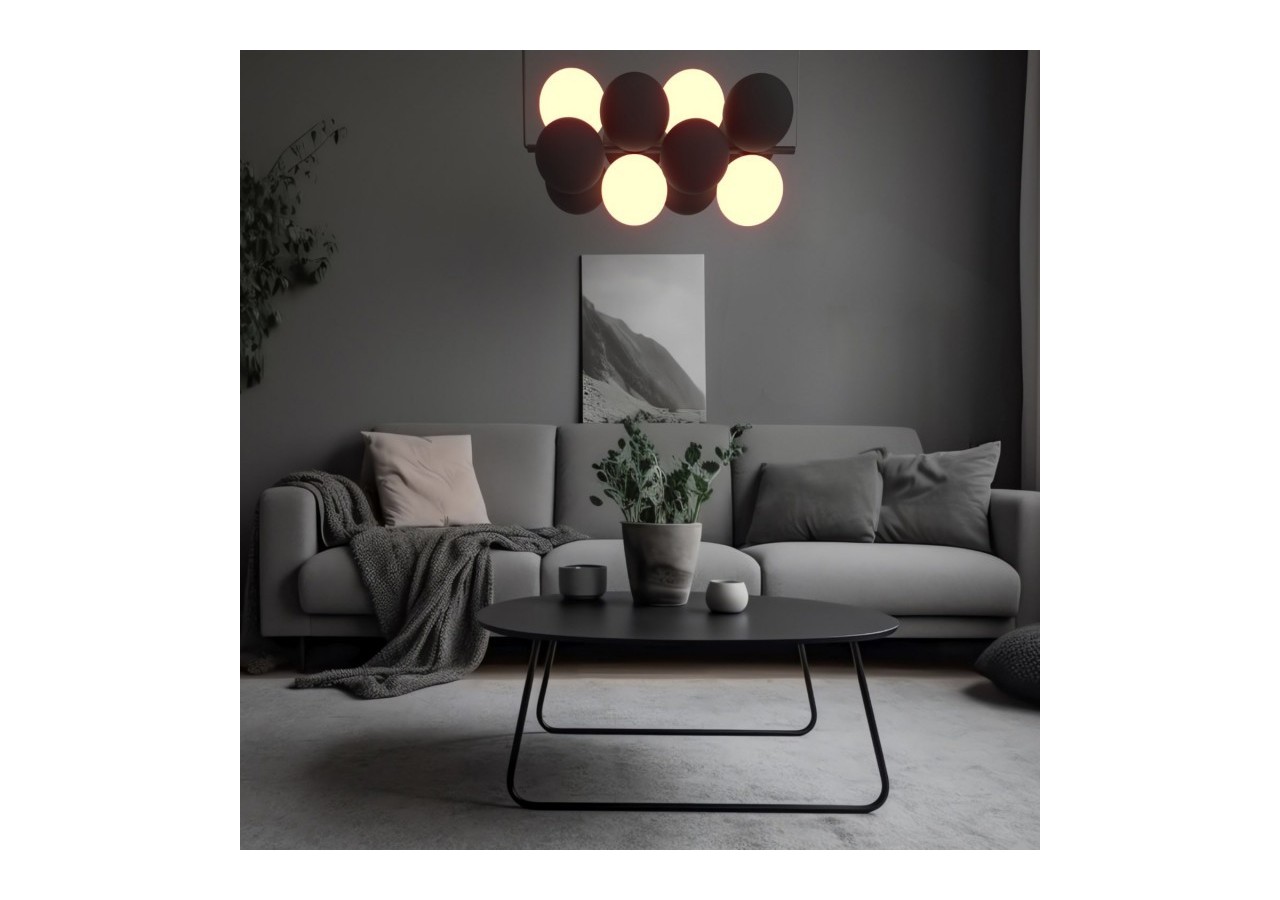 Les sphères lumineuses en verre opalin diffusent une lumière douce et enveloppante, créant une atmosphère décontractée et moderne. Le design horizontal permet une distribution uniforme de la lumière, soulignant l'élégance des formes abstraites et créant un jeu d'ombres fascinant.