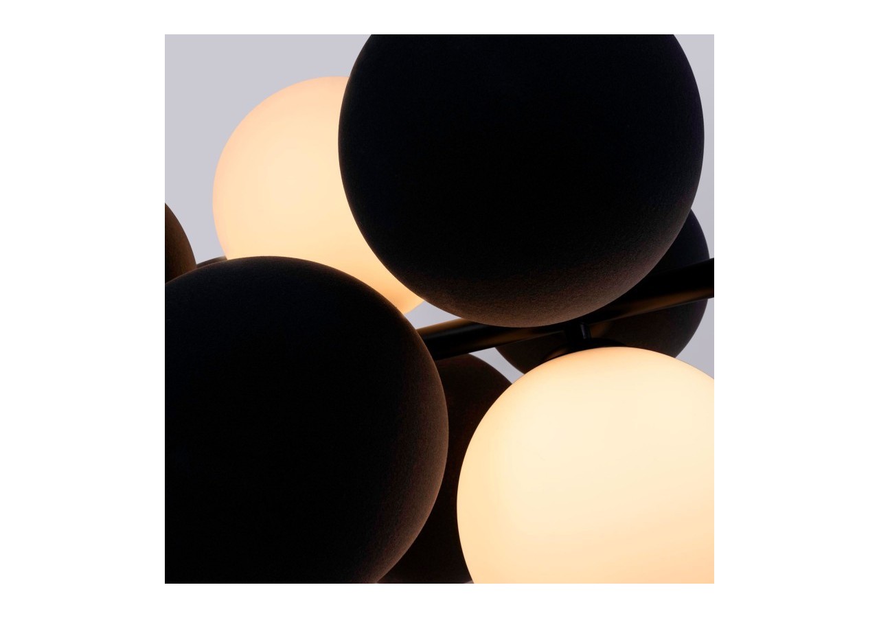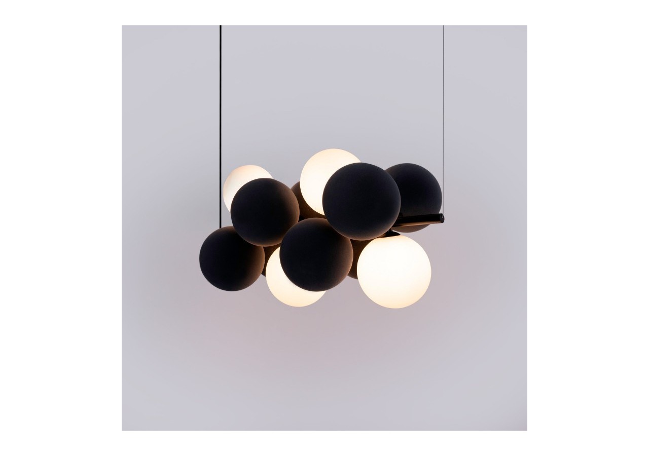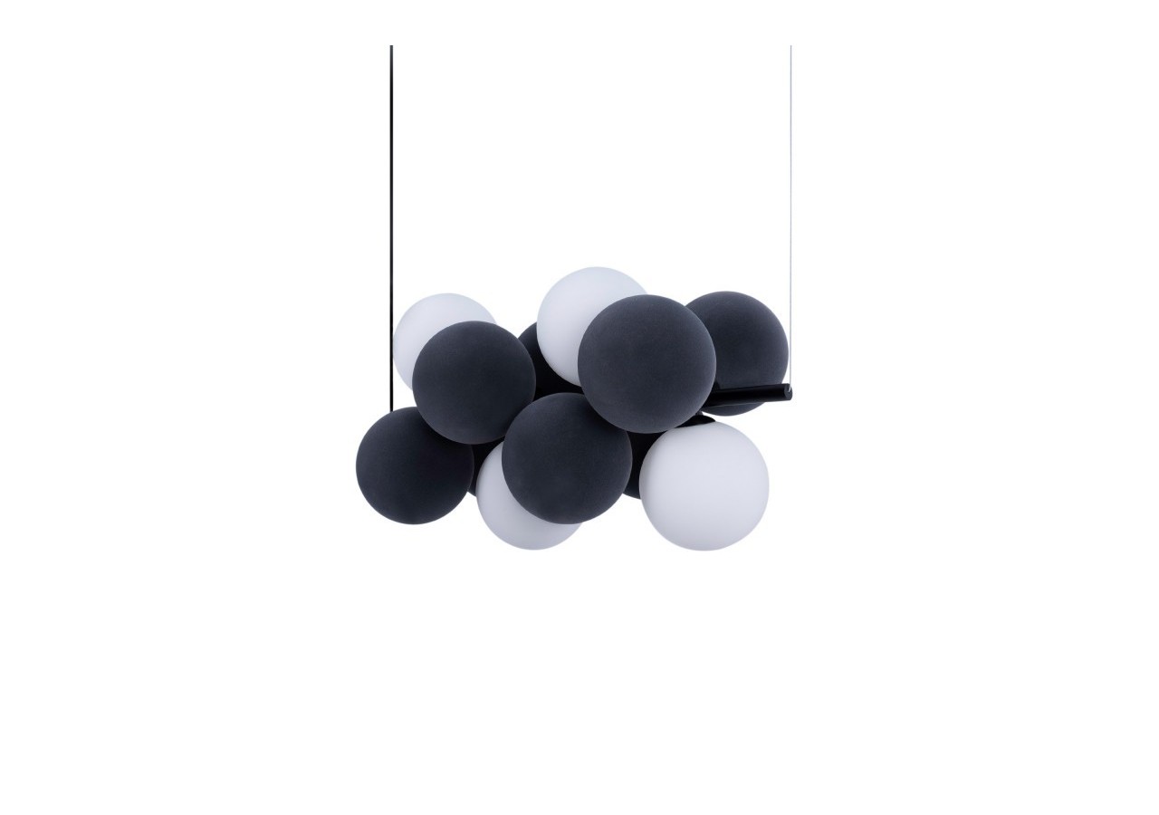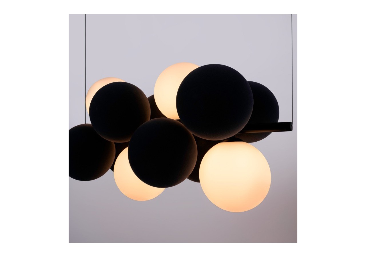 Inspirée par l'essence de l'abstrait, cette pièce présente undesignhorizontal, composé de 12 globes de ø 140mm chacun : 4 globes lumineux (ampoules G9) en verre opale et 8 absorbeurs recouverts d'une housse textile acoustique, disponible en gris ou en marron.
