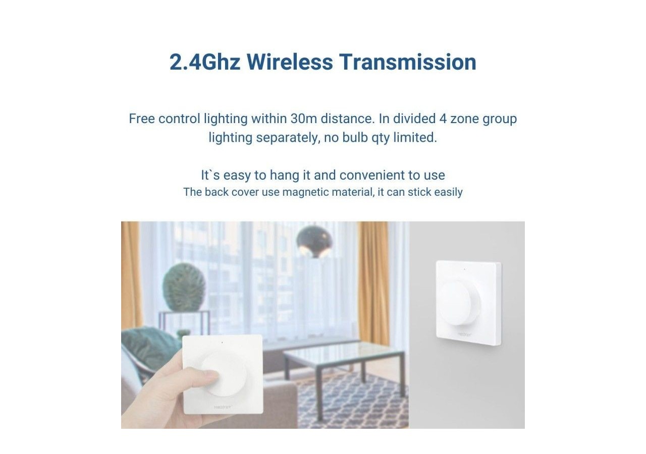 La télécommande murale RF est équipée de la technologie de contrôle sans fil 2,4 GHz, caractérisée par une faible consommation d'énergie, un système anti-interférences et une communication rapide.