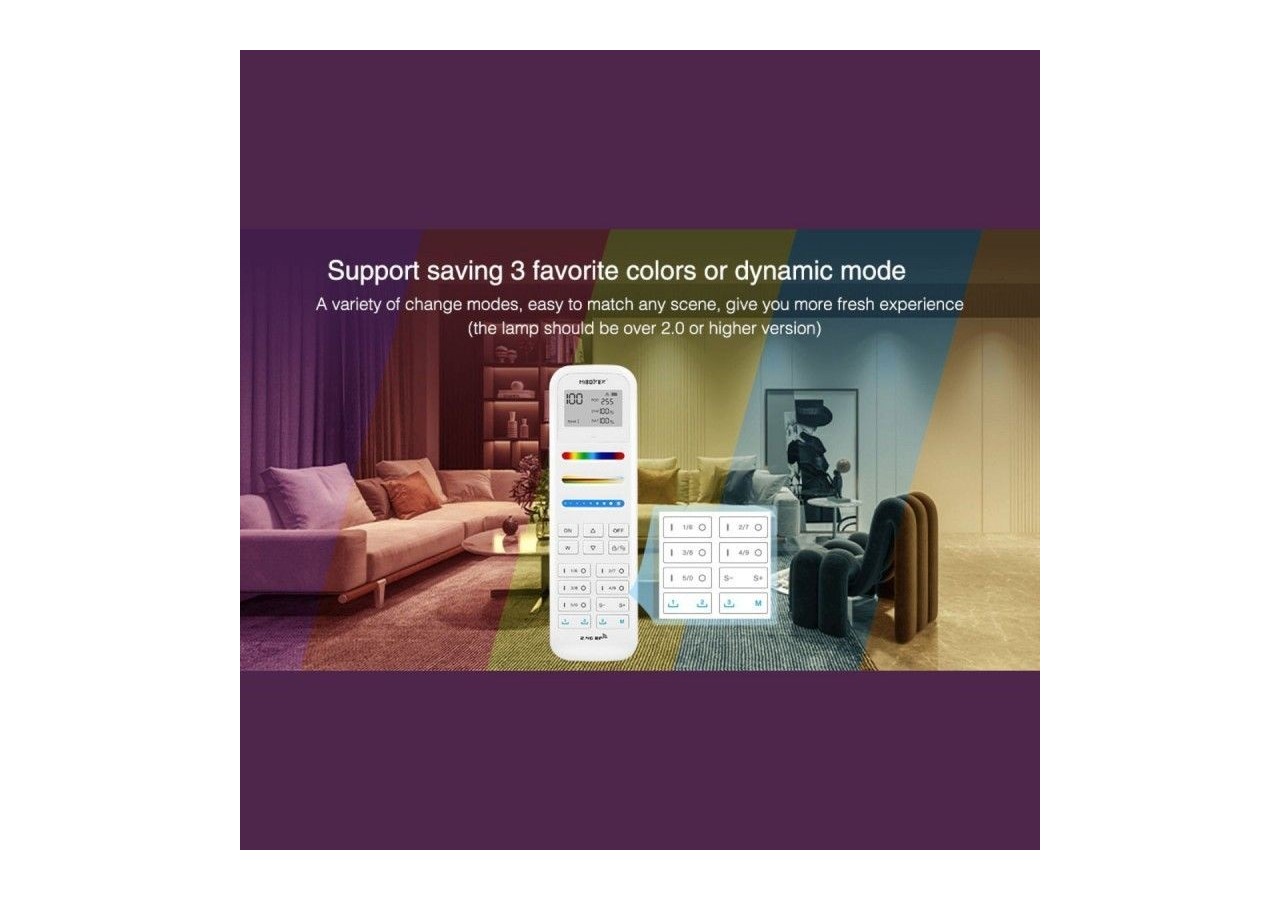 La fonction de mémorisation de 3 scènes ou réglages pour la tonalité, la couleur, et la luminosité est disponible, mais uniquement pour les contrôleurs et les ampoules Miboxer-Milight 2.0 ou plus. De plus, la télécommande propose la fonction "One-click", simplifiant le processus de copie d'une télécommande à une autre.