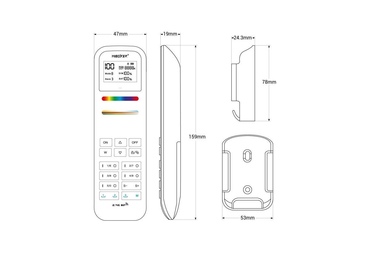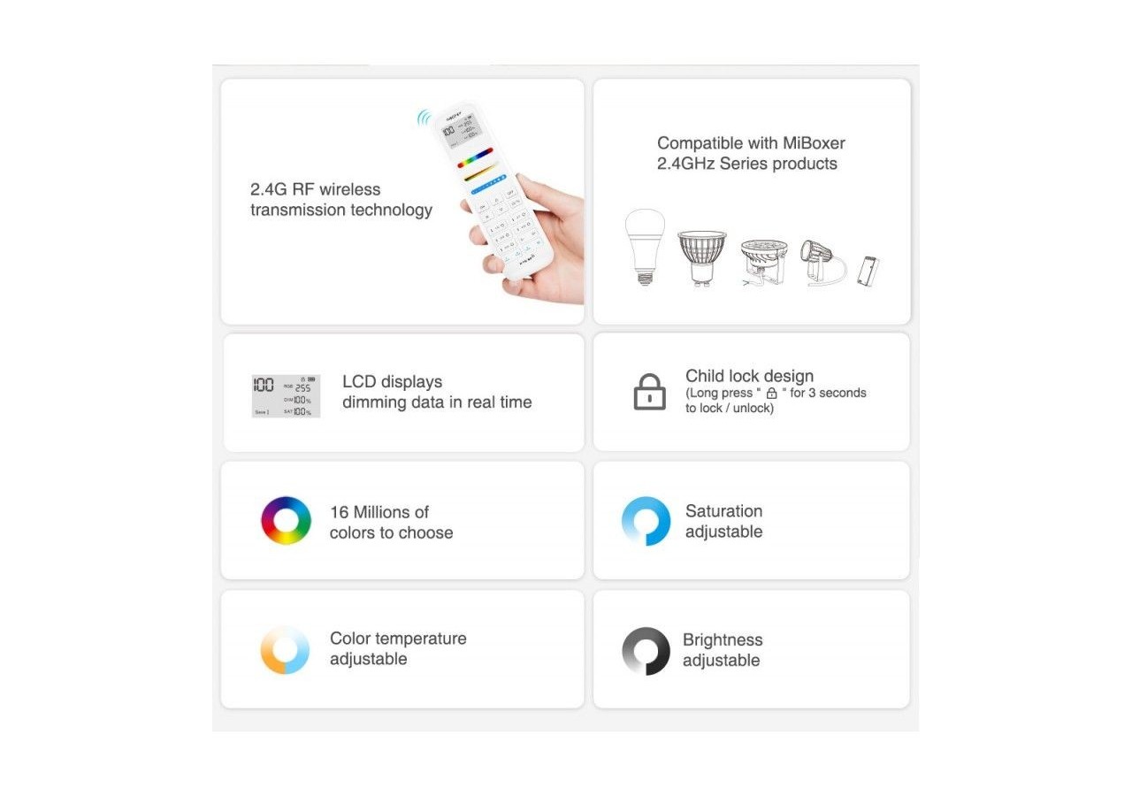 Cette télécommande est parfaitement compatible avec tous les produits Miboxer 2.4Ghz. Elle offre un contrôle précis des couleurs RGB (avec une palette de 16 millions de couleurs), de la température de couleur CCT, et de la luminosité grâce à trois barres tactiles intuitives.
