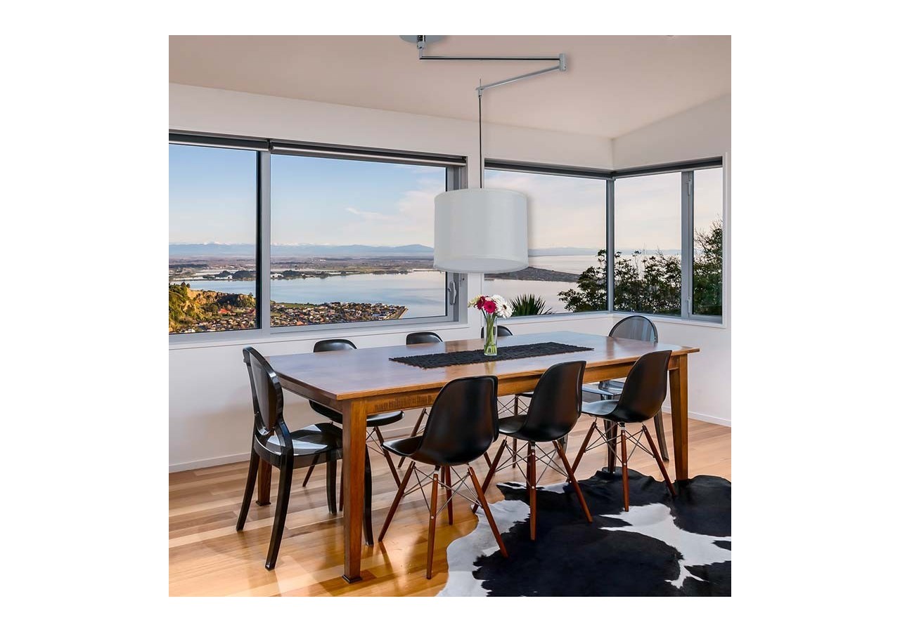 Lampe suspendue élégante avec bras mobile articulé, finition chrome de haute qualité. La lampe est équipée d'un porte-ampoule E27 à l'intérieur de l'abat-jour en tissu.