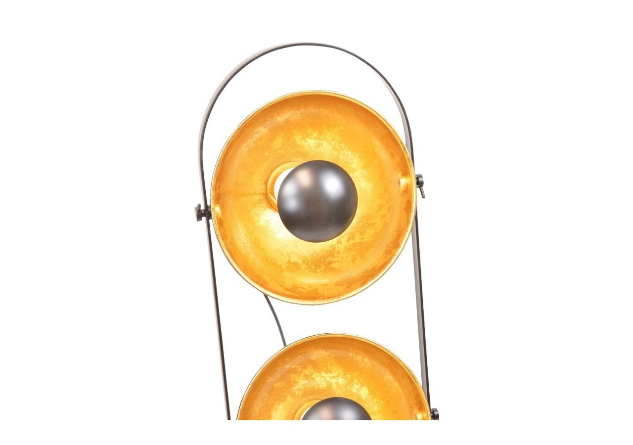 La lampe vintage possède trois têtes noires à l'intérieur doré. Vous pouvez orienter la lumière de ces trois têtes où vous le souhaitez car celles-ci sont orientables. Letrépied de la lampe peut lui aussi être orienté vers d'autres directions. La couleur extérieure de la lampe est noire, et l'intérieur doré des têtes est mis en valeur lorsque l'on allume les ampoules,cela génère une lumière indirecte dans la direction donnée. La hauteur de la lampe est de 1060 mm et la largeur est de300 mm.
