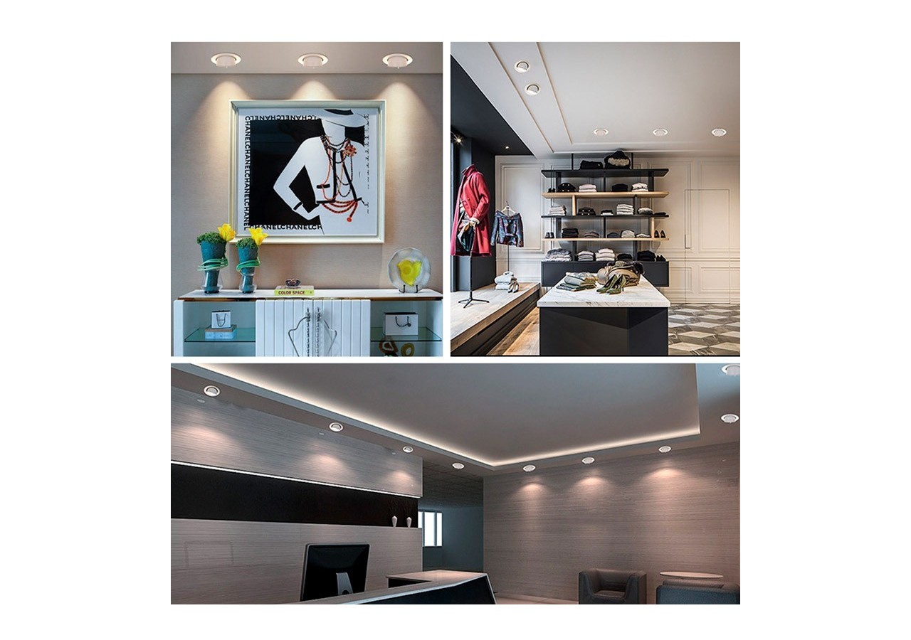Spot LED encastrable orientable et basculable, à haute efficience énergétique, pour commerces, bureaux, écoles, hôtels.