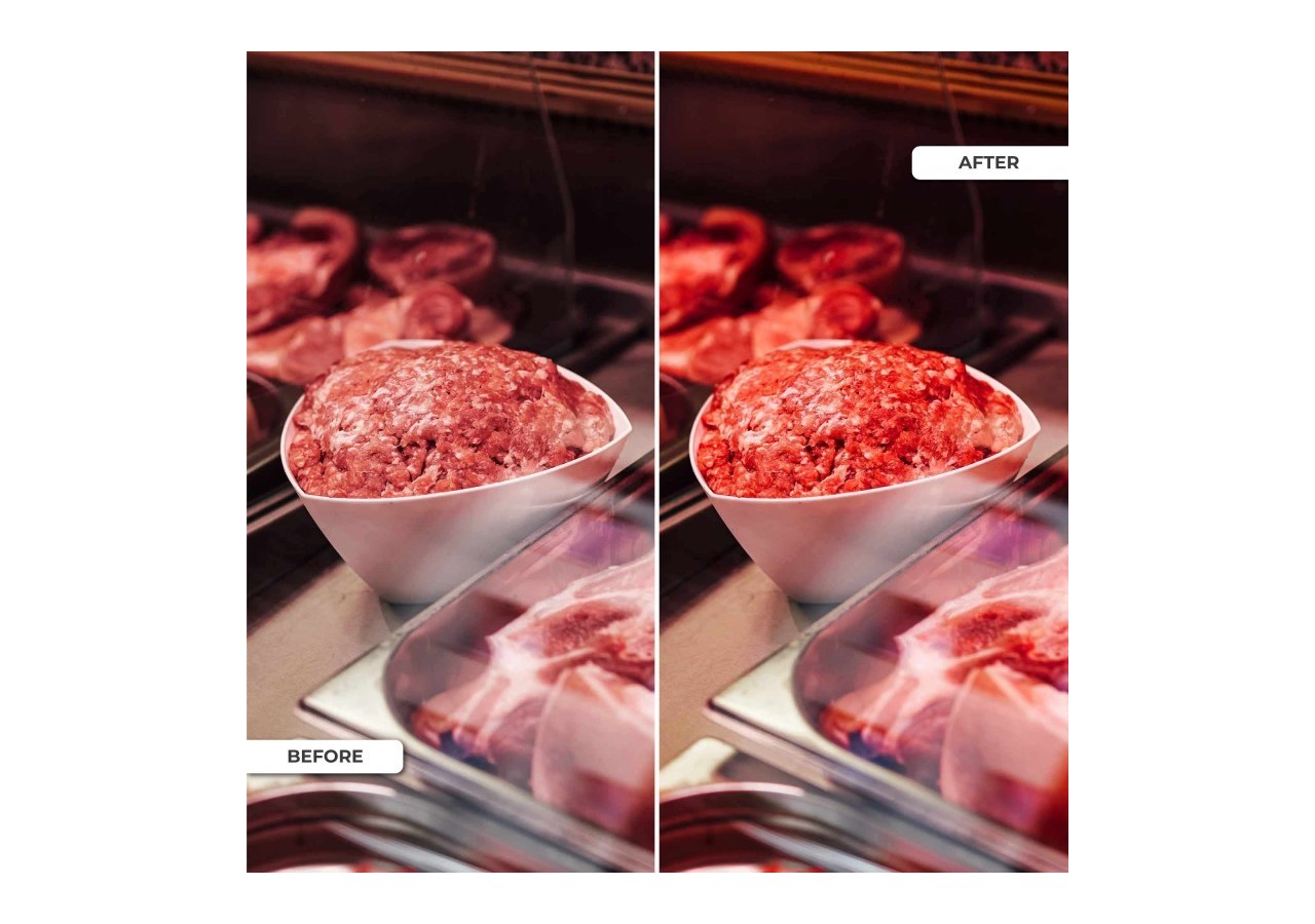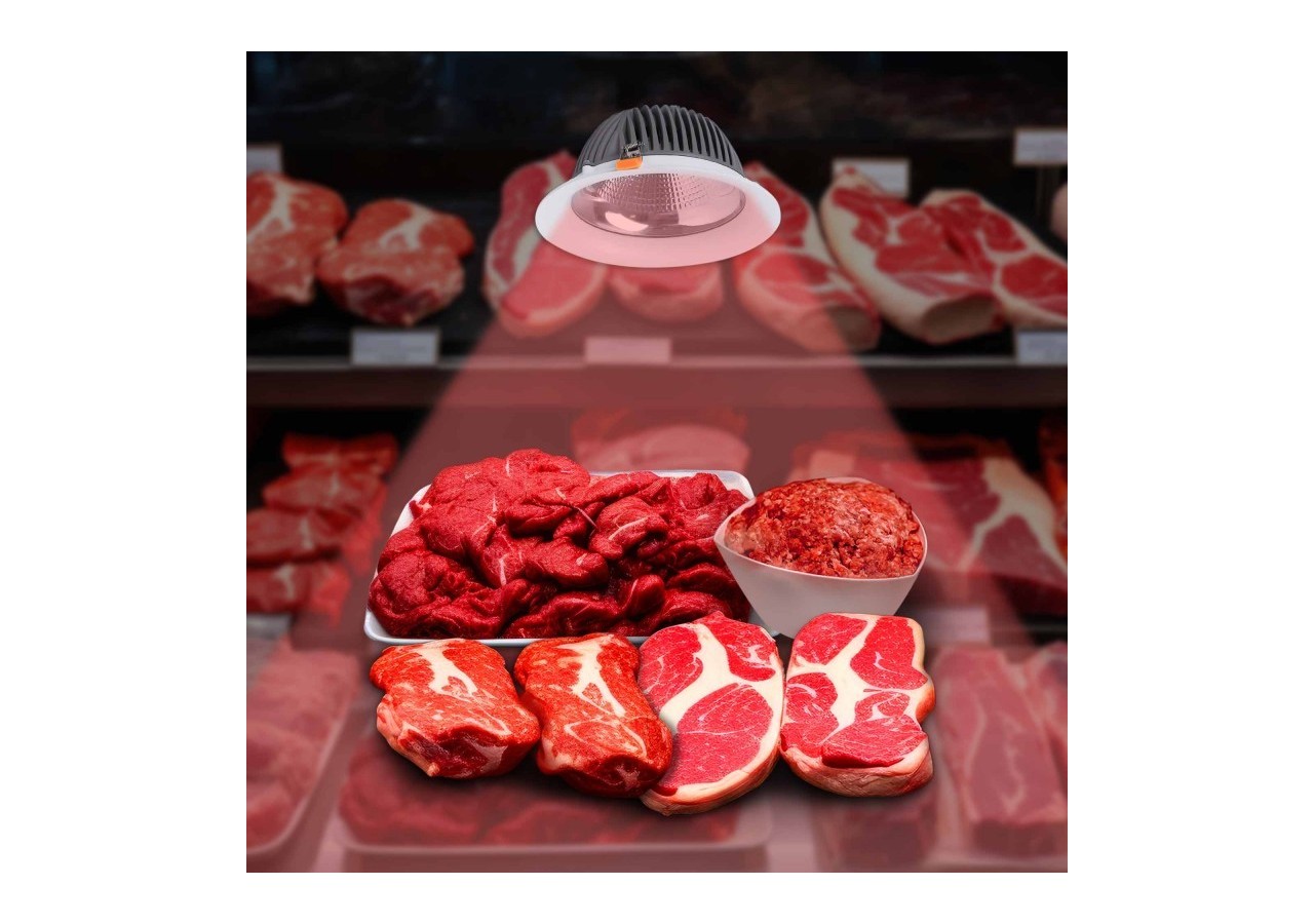 Sa lumière dans une nuance rosée sublime la couleur naturelle de la viande, la présentant de manière fraîche et appétissante, influençant positivement la perception des clients et favorisant leur décision d'achat.