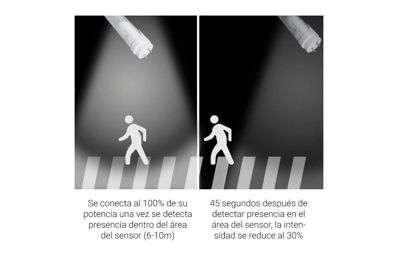 Le tube LED T8 avec capteur de proximité à micro-ondes intègre un capteur de présence et de proximité, permettant à un objet ou à une personne d'être détecté à une distance d'environ 6 à 10 mètres. Le capteur micro-ondes détecte la présence et fait fonctionner le tube au maximum de sa puissance. Dès que vous quittez la plage d'action du tube LED, après 45 secondes, il réduit sa luminosité à 30% de sa puissance, offrant une lumière de courtoisie plus que suffisante avec une consommation minimale.
