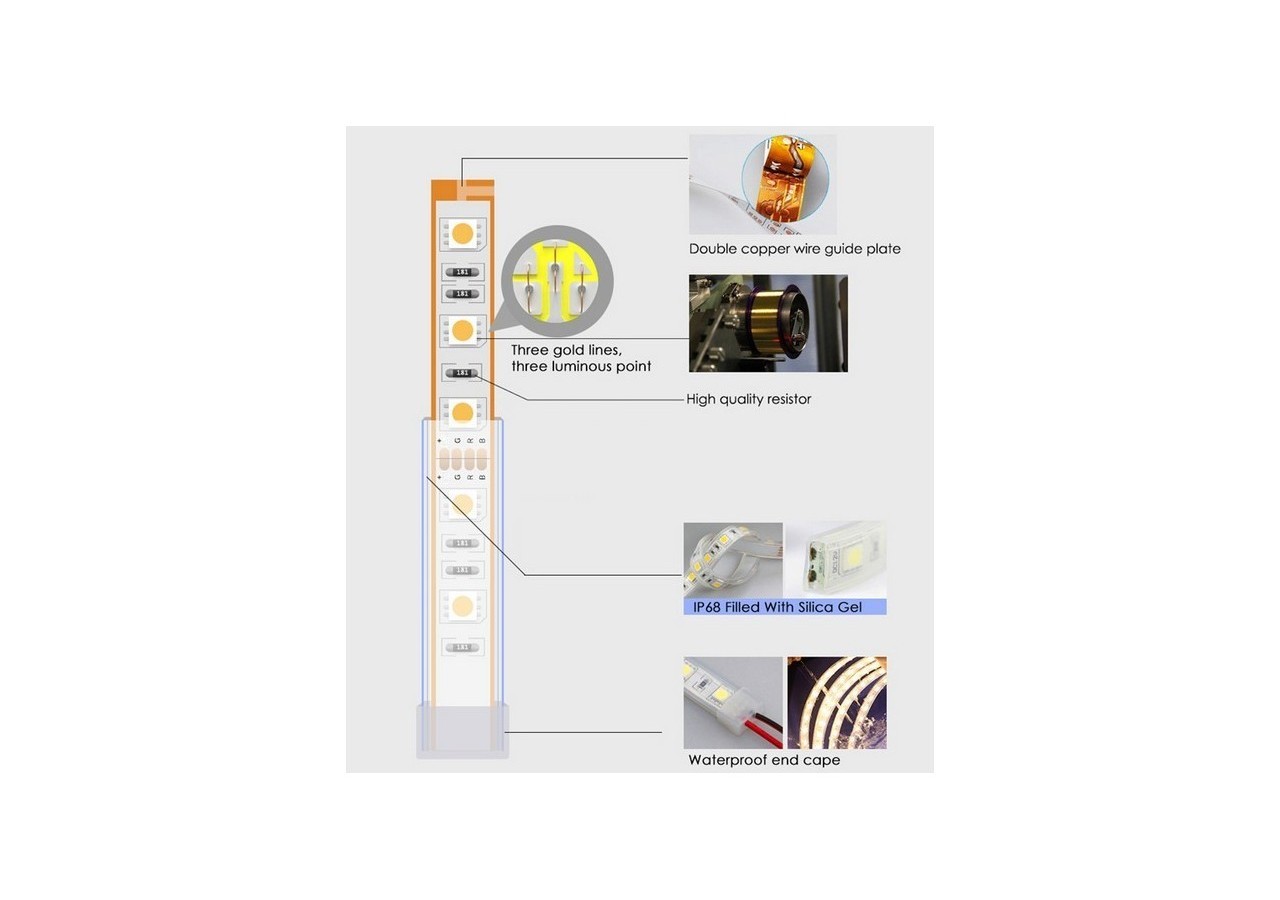 Cette gamme de rubans LED RGB professionnels comprend 60 puces par mètres, fournissant ainsi un faisceau complétement homogène. Les bandes LED ou RGB peuvent produire presque toutes les couleurs imaginables selon le contrôleur RGB auquel on les connecte (vendu séparément).