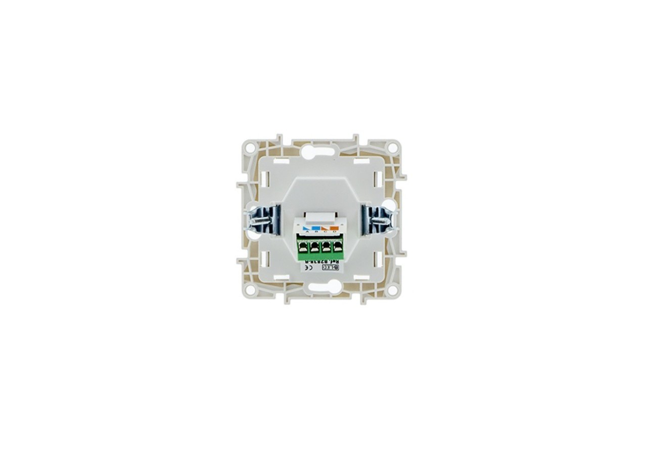 Prise téléphone encastrable avec fiche universelle RJ11. Bien que le dispositif soit conçu pour s'encastrer dans un boîtier universel, il est doté de griffes à l'arrière permettant de l'adapter à des boîtiers non standard.