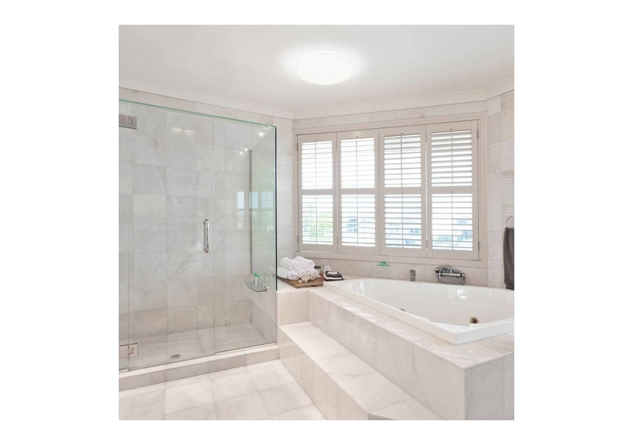 Spécialement conçu pour une utilisation en environnement humide (salles de bain, cuisines, buanderies, extérieurs abrités de la pluie, etc.), ceplafonnier LED de surface ne consomme que 18W. Grâce à un indice de protection étanche IP65, son boîtier est également hermétique aux insectes, à la poussière et à la saleté : le luminaire reste propre et son éclairage reste intenseen toutes circonstances.