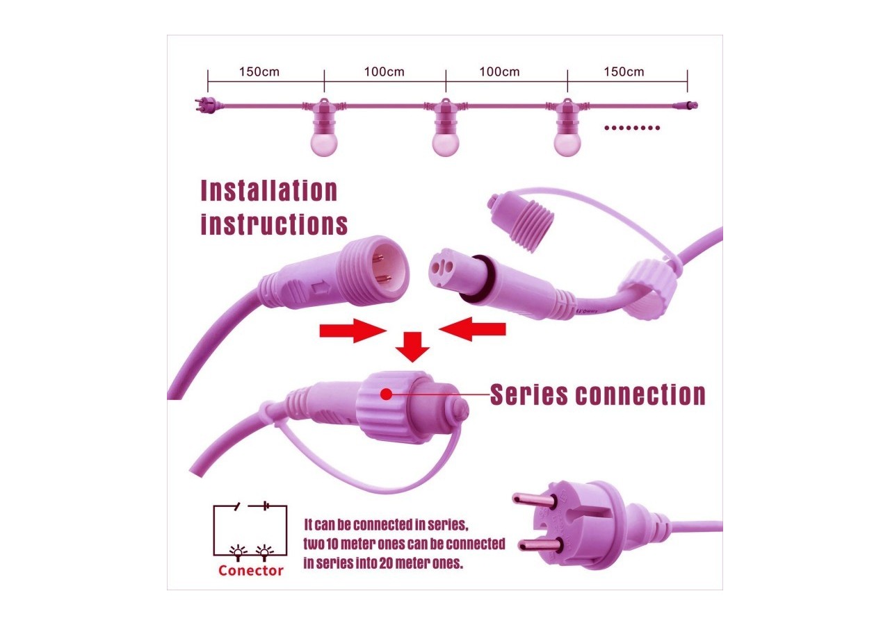 Doté d'une longueur de 10 mètres et d'un espacement d'1 mètre entre les ampoules, ce câble guirlande permet un agencement harmonieux. De plus, ces guirlandes peuvent être enchaînées les unes aux autres pour créer des rangées lumineuses de plus grande envergure.