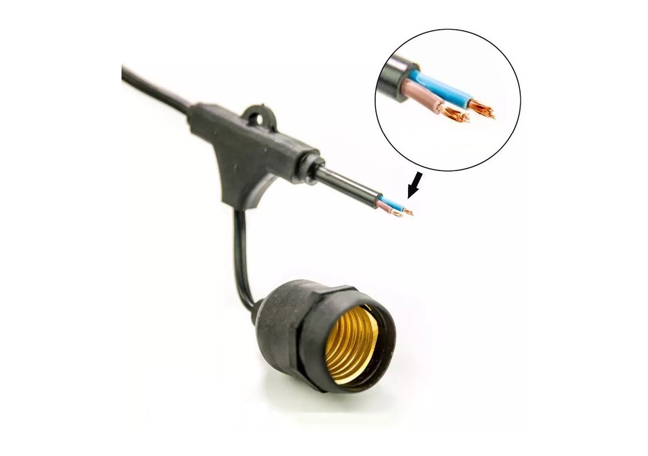 Câble de guirlande lumineuse conçu pour l'éclairage extérieur, équipé de 10 douilles E27 pour apporter une touche d'illumination et d'embellissement à vos patios, terrasses, pergolas, bars, restaurants ou événements en plein air. Il offre la possibilité de métamorphoser chaque recoin en un espace à la fois charmant et unique.