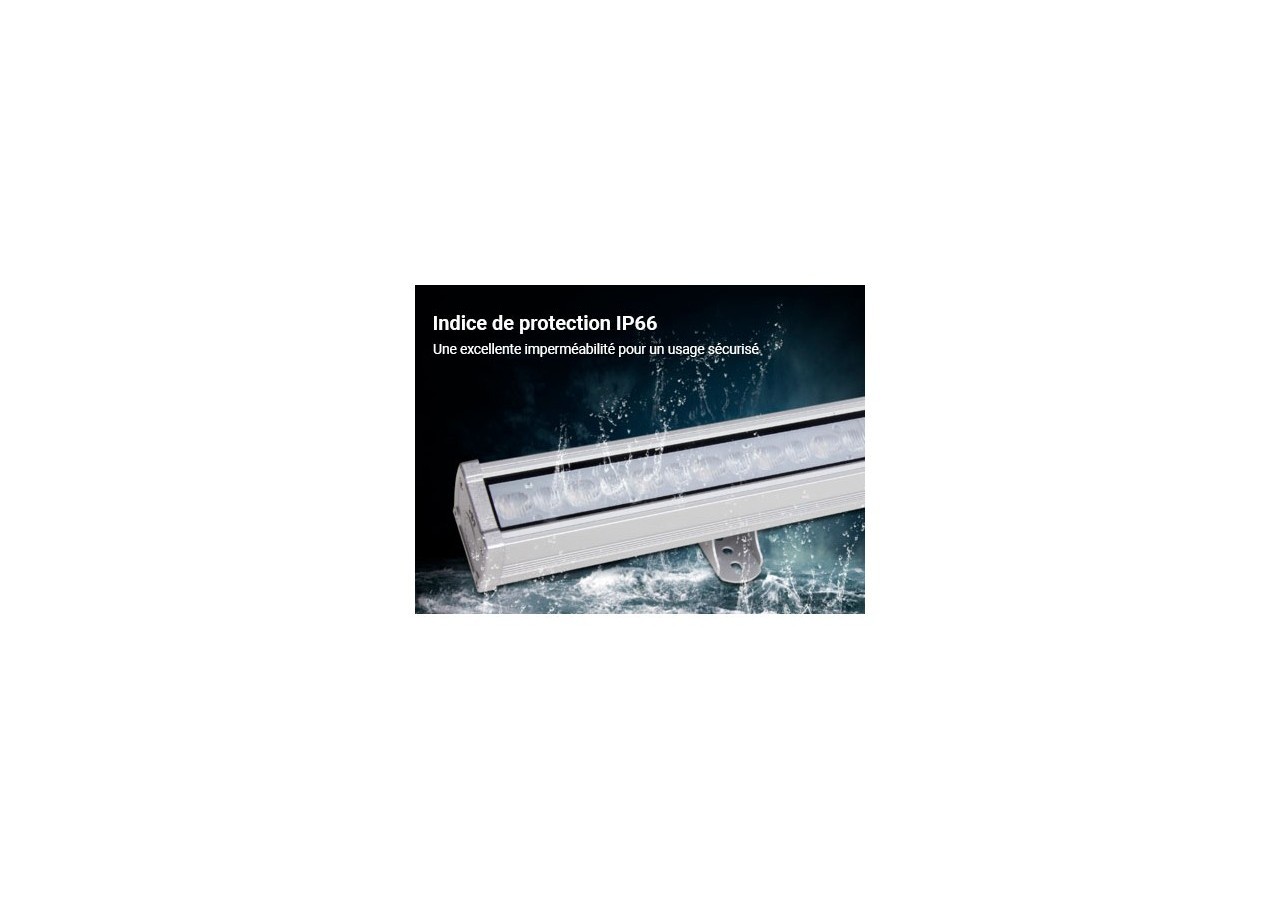 La rampe lumineuse LEDde 24W permet, à travers une connexion à distance ou via WiFi depuis un dispositif mobile, de combiner 16 millions de couleurs RGB. Il est également possible d'en contrôler la température CCT (de blanc chaud 2700ºK à blanc froid 6500ºK), de même que l'intensité lumineuse, le contraste, etc. Avec ces lèche murs LED, vous pourrez baigner vos murs de lumière dans la couleur de votre choix, pour un rendu spectaculaire et très original. Cette rampe LED RGB + CCT offre une intensité lumineuse de1800 lumens, soit un excellent rendement de 75 lm/W. Son indice de reproduction des couleurs est supérieur à 80 (IRC>80), avec un facteur de puissance de >0,9. Ce luminaire à LED d'extérieur affiche une durée de vie utile de plus de 50 000 heures. Son support est orientable à un angle de 180 degrés.