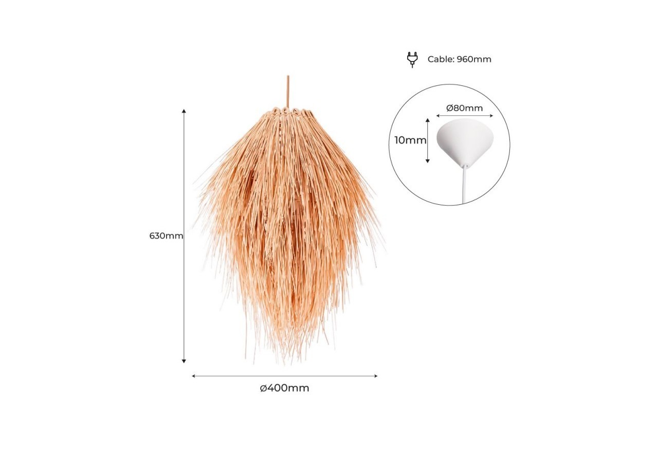 Ce beau luminaire à suspendre est idéal pour apporter une touche exotique ou rétro à votre décoration. Son cache-fils est en aluminium laqué blanc, et le corps de la lampe est formé de long brins de osier (leosier est un palmier à lianes qui fournit un matériau très flexible et résistant, trouvant de nombreuses applications – en vannerie, notamment).