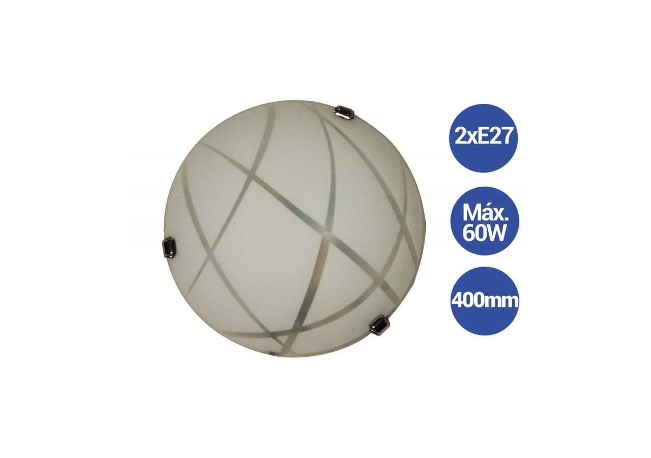 Spécifications techniques : Tension : 220-240 V/CA. Douilles : 2xE27 - Ampoules non fournies. Fréquence : 50-60 Hz. Puissance : 2x60W max. Dimensions : ø 400x80mm. Indice de protection : IP20. Matériau : verre. |